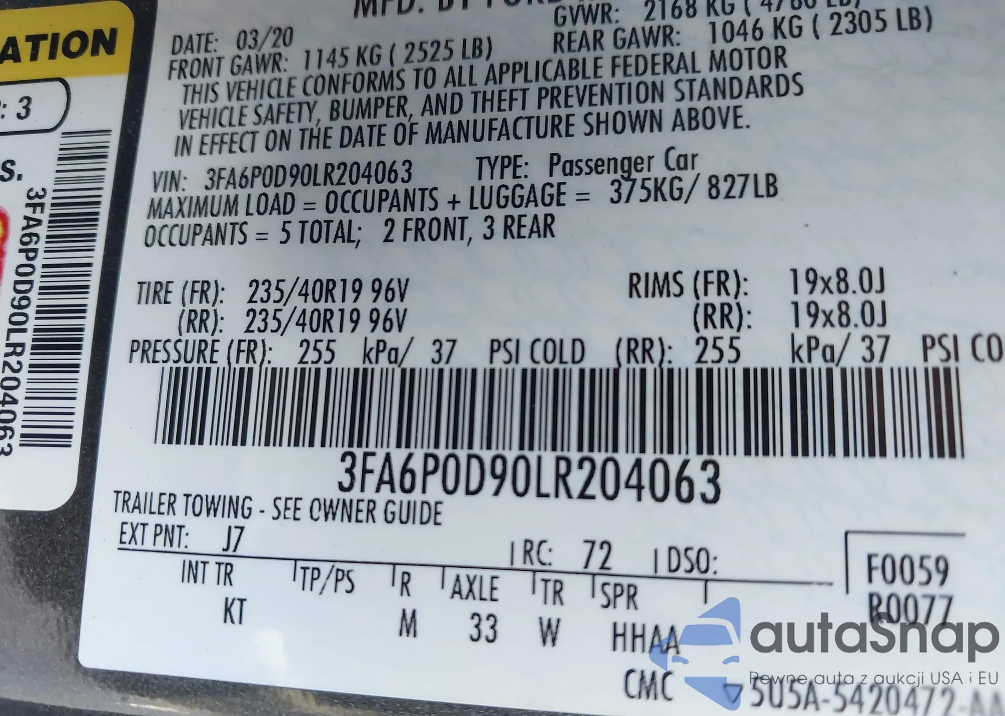 LOT: 43977869 VIN: 3FA6P0D90LR204063