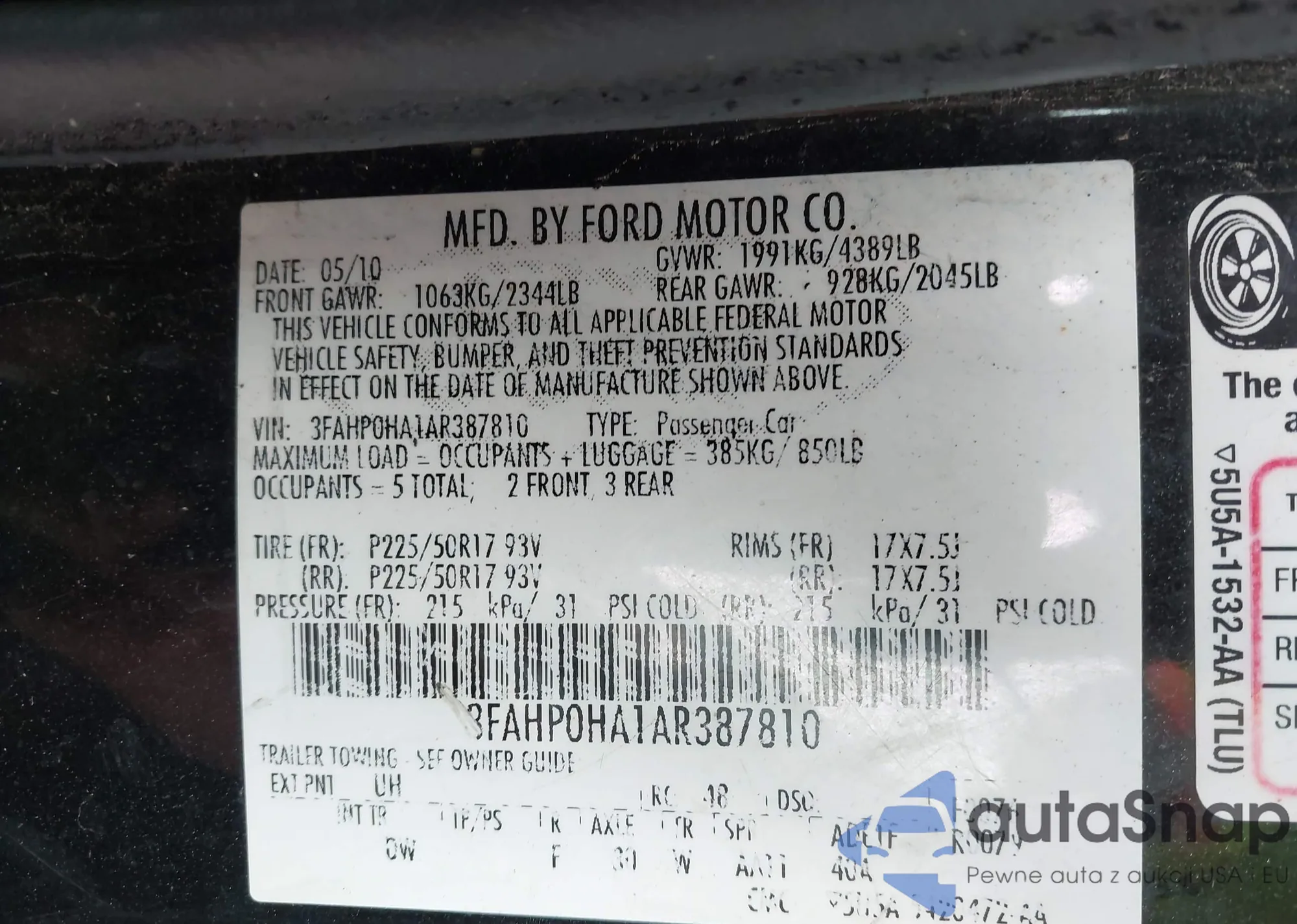 • VIN 3FAHP0HA1AR387810
