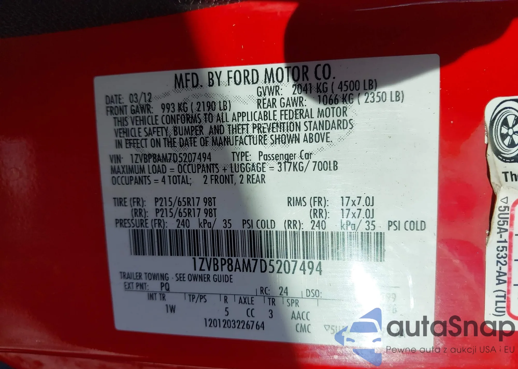 LOT: 44197989 VIN: 1ZVBP8AM7D5207494