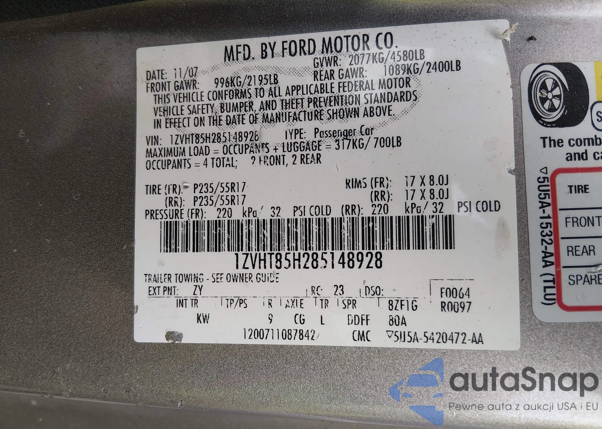 • VIN 1ZVHT85H285148928
