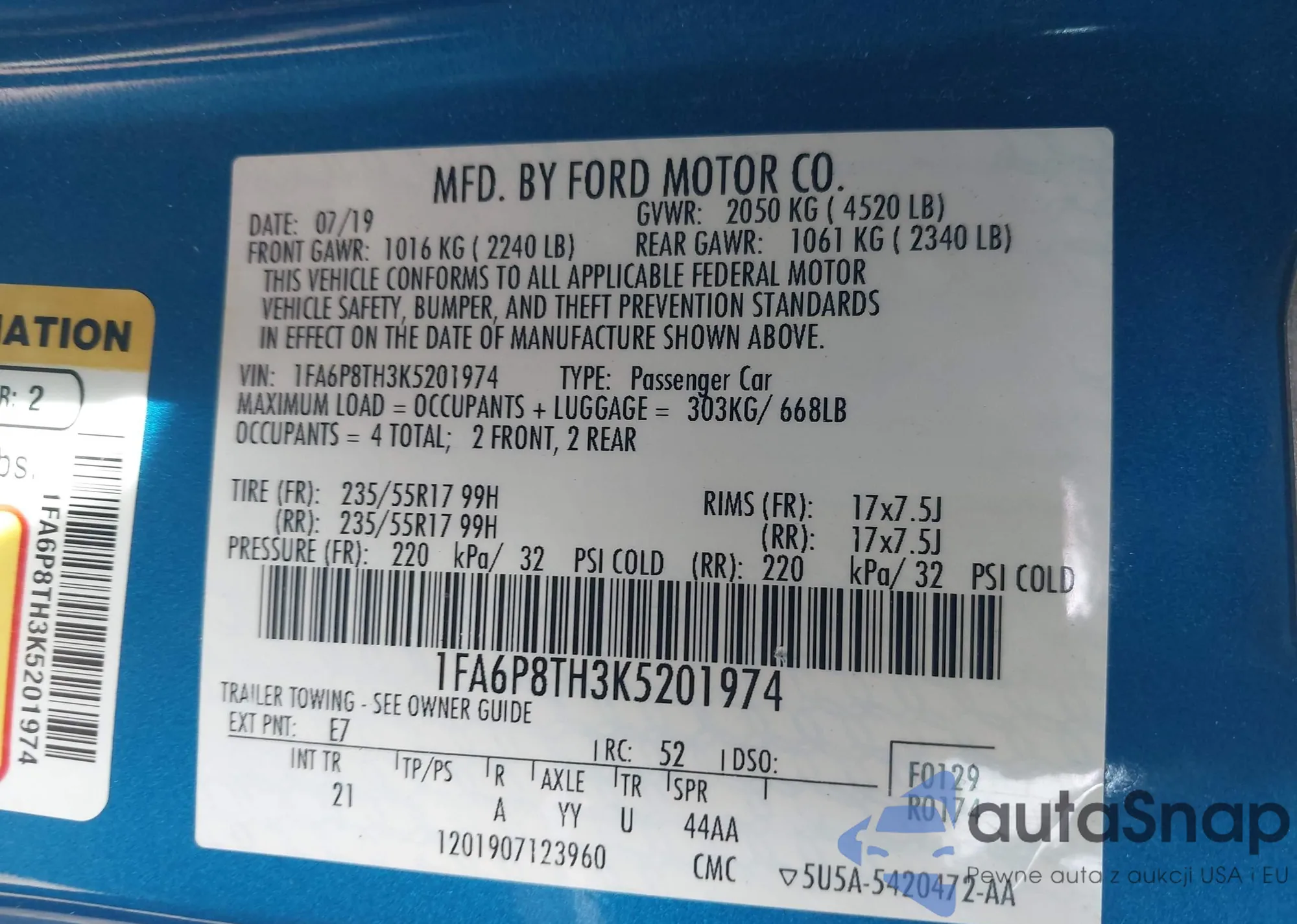 • VIN 1FA6P8TH3K5201974