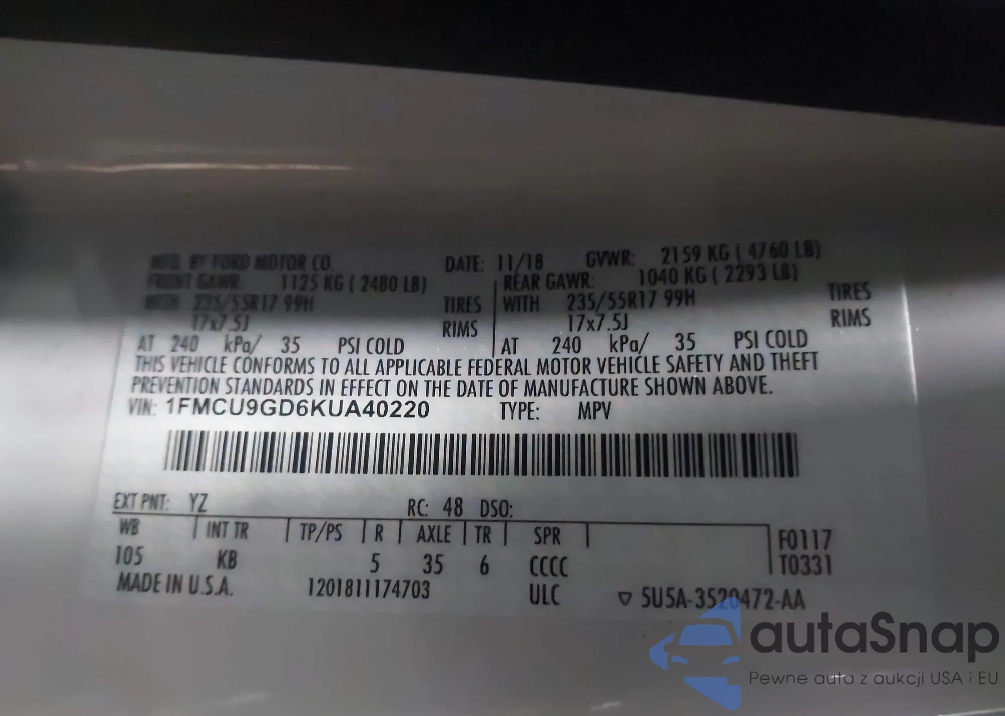 • VIN 1FMCU9GD6KUA40220