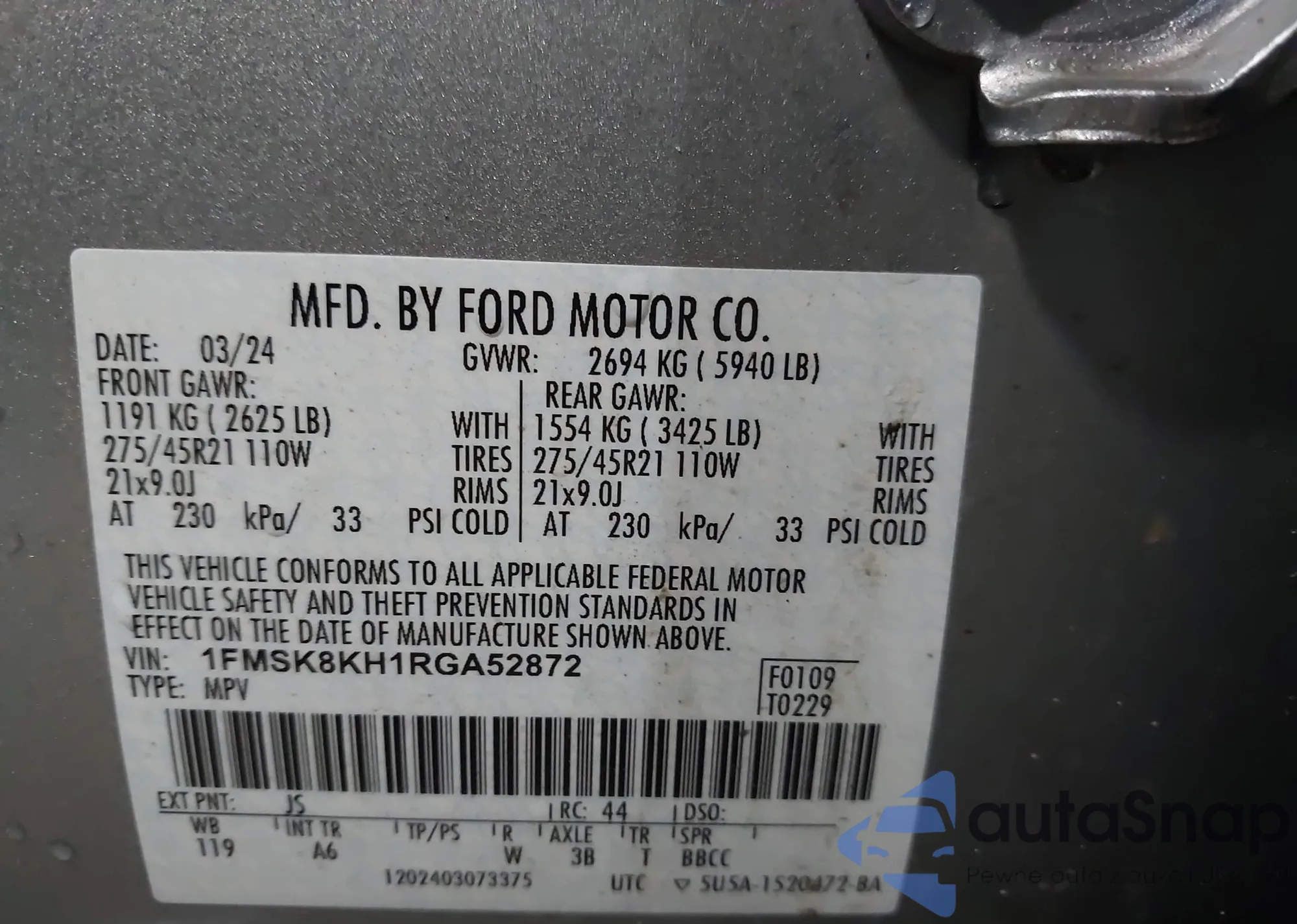 LOT: 44338805 VIN: 1FMSK8KH1RGA52872