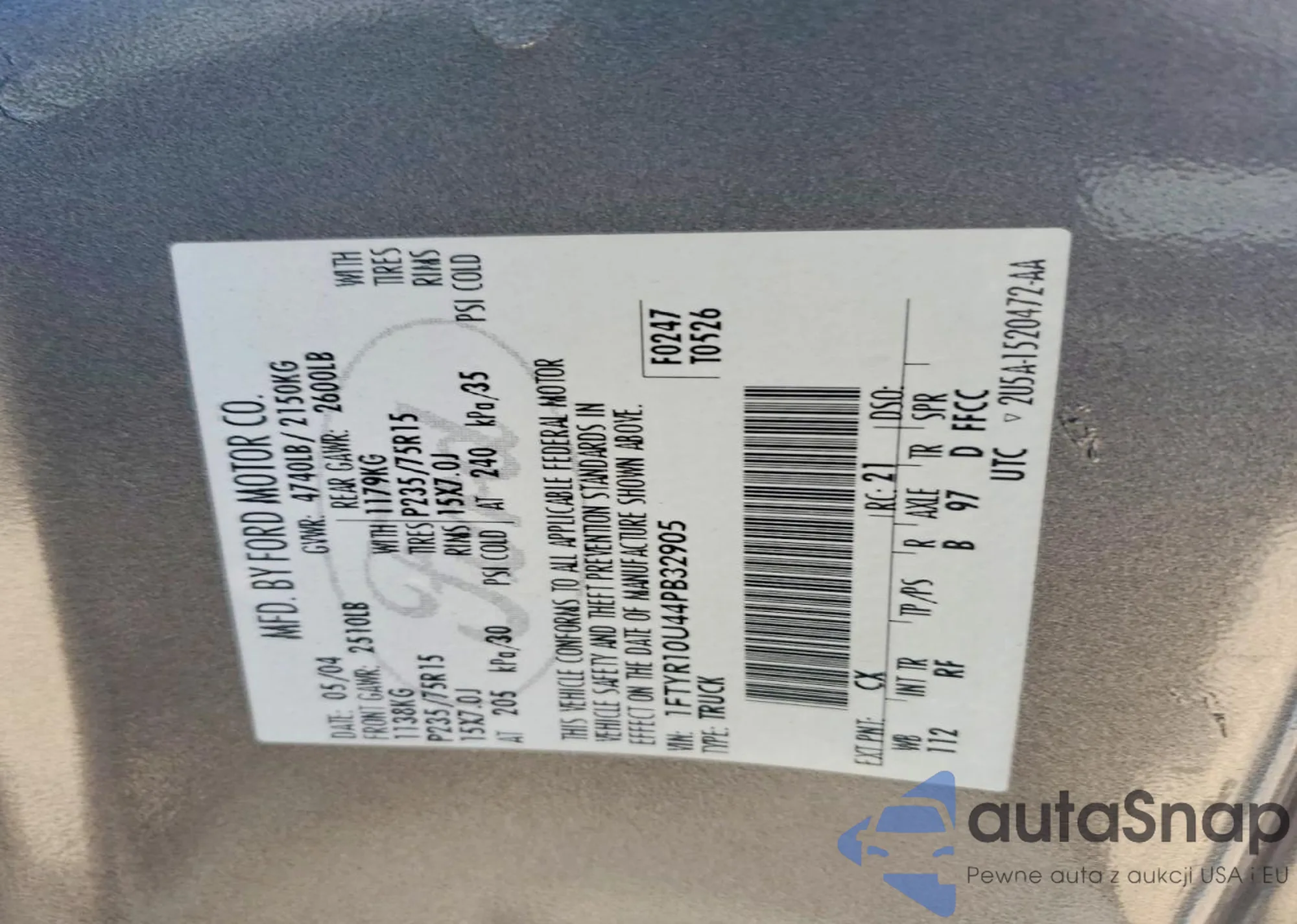 LOT: 74657105 VIN: 1FTYR10U44PB32905