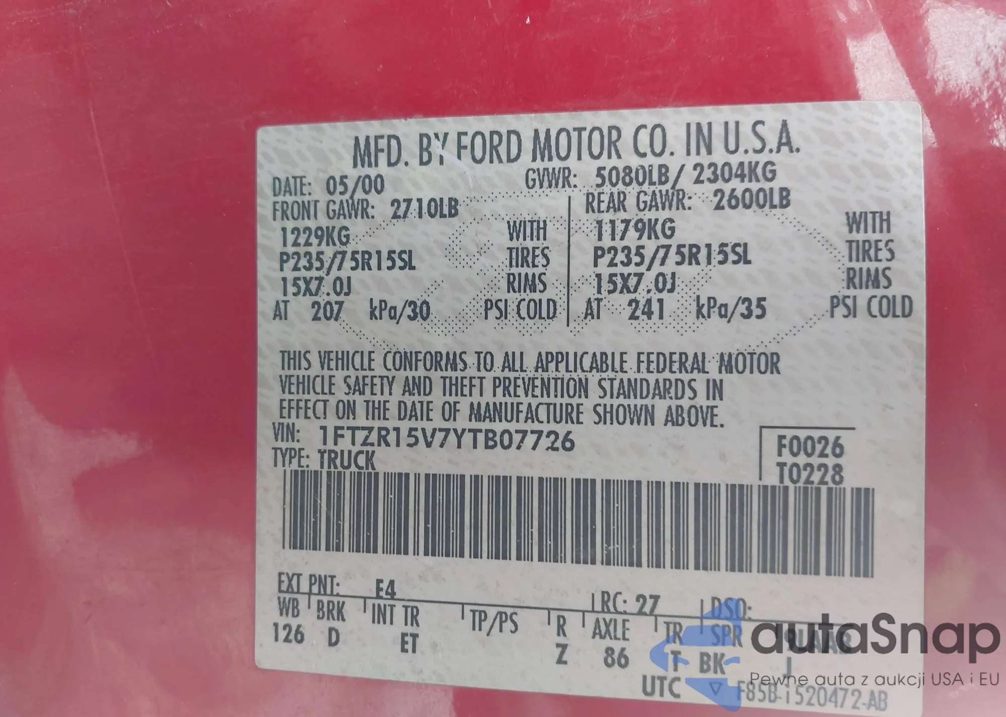 LOT: 44234222 VIN: 1FTZR15V7YTB07726