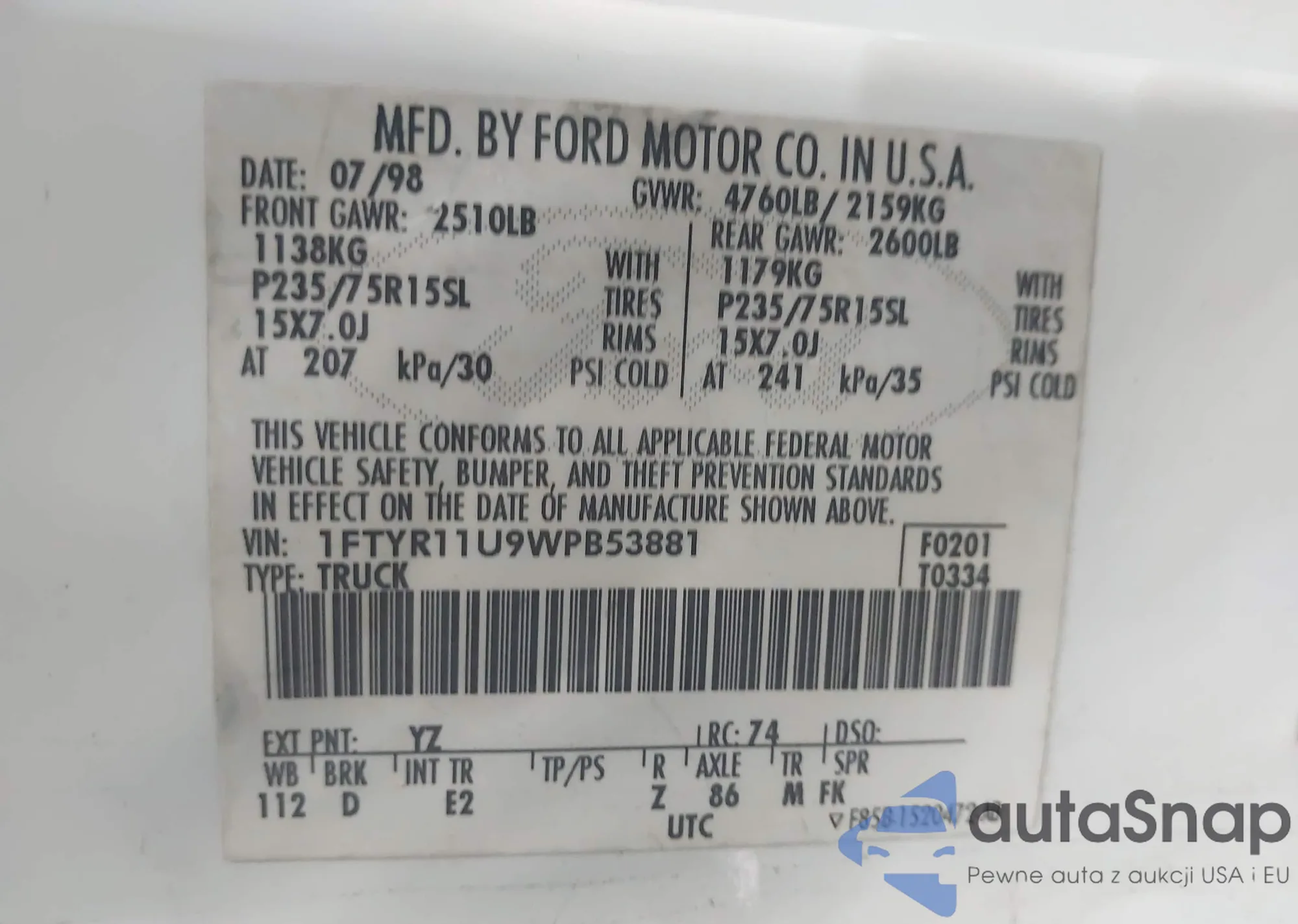 • VIN 1FTYR11U9WPB53881