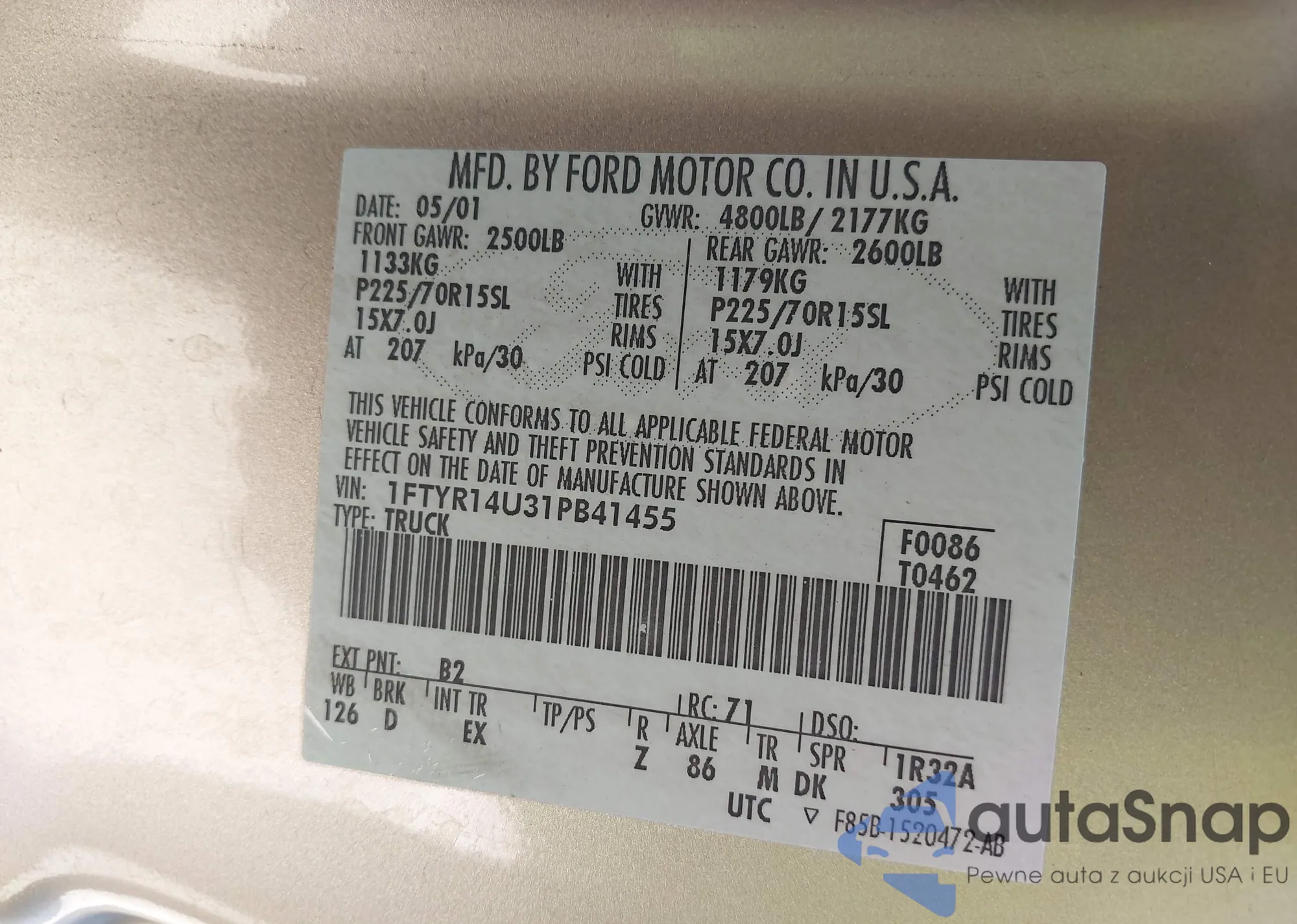 • VIN 1FTYR14U31PB41455