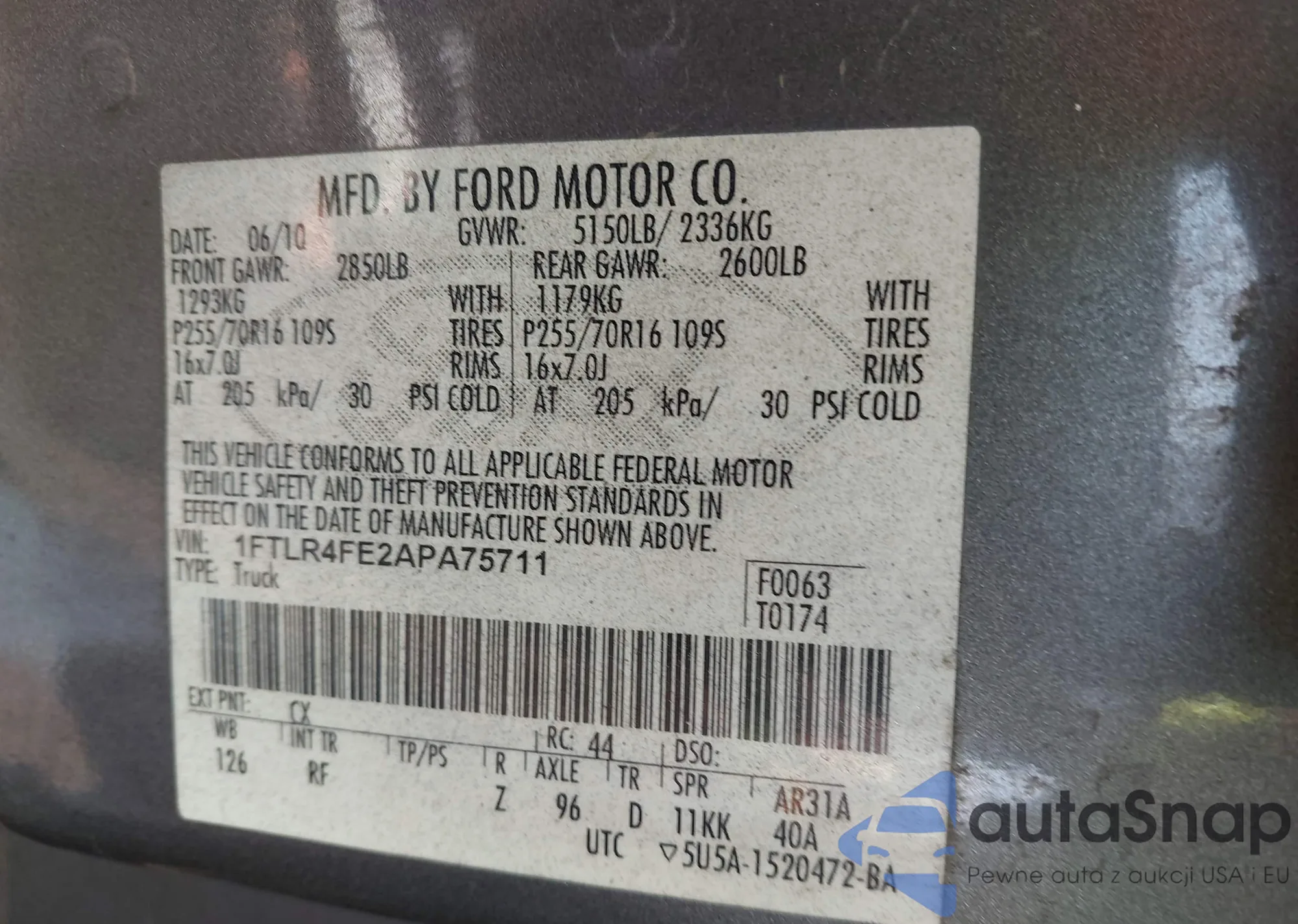 LOT: 44127508 VIN: 1FTLR4FE2APA75711