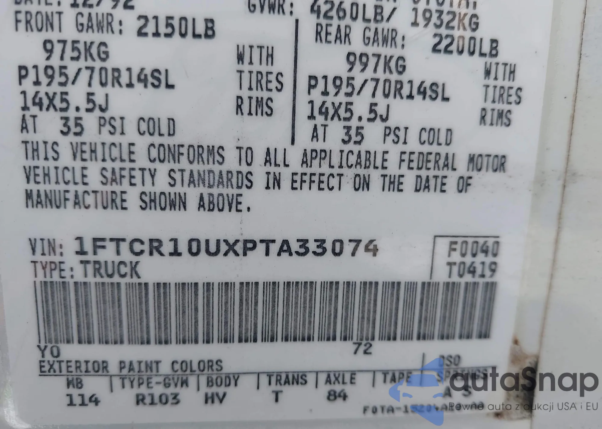• VIN 1FTCR10UXPTA33074