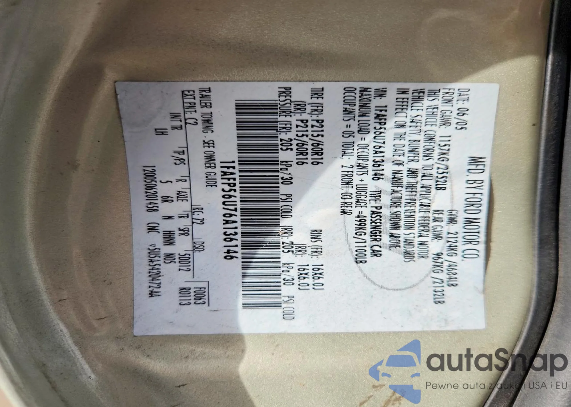 • VIN 1FAFP56U76A136146