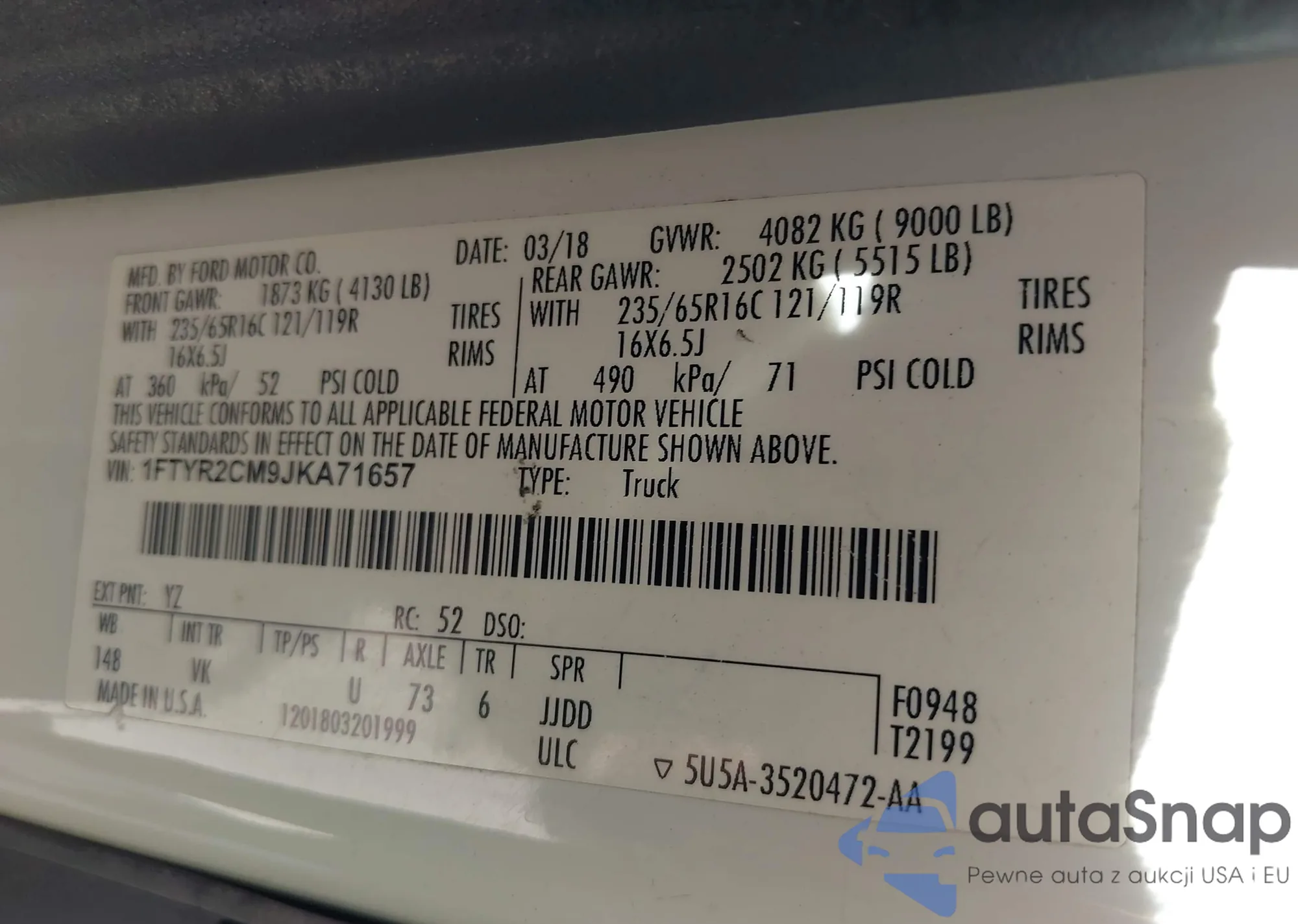 • VIN 1FTYR2CM9JKA71657