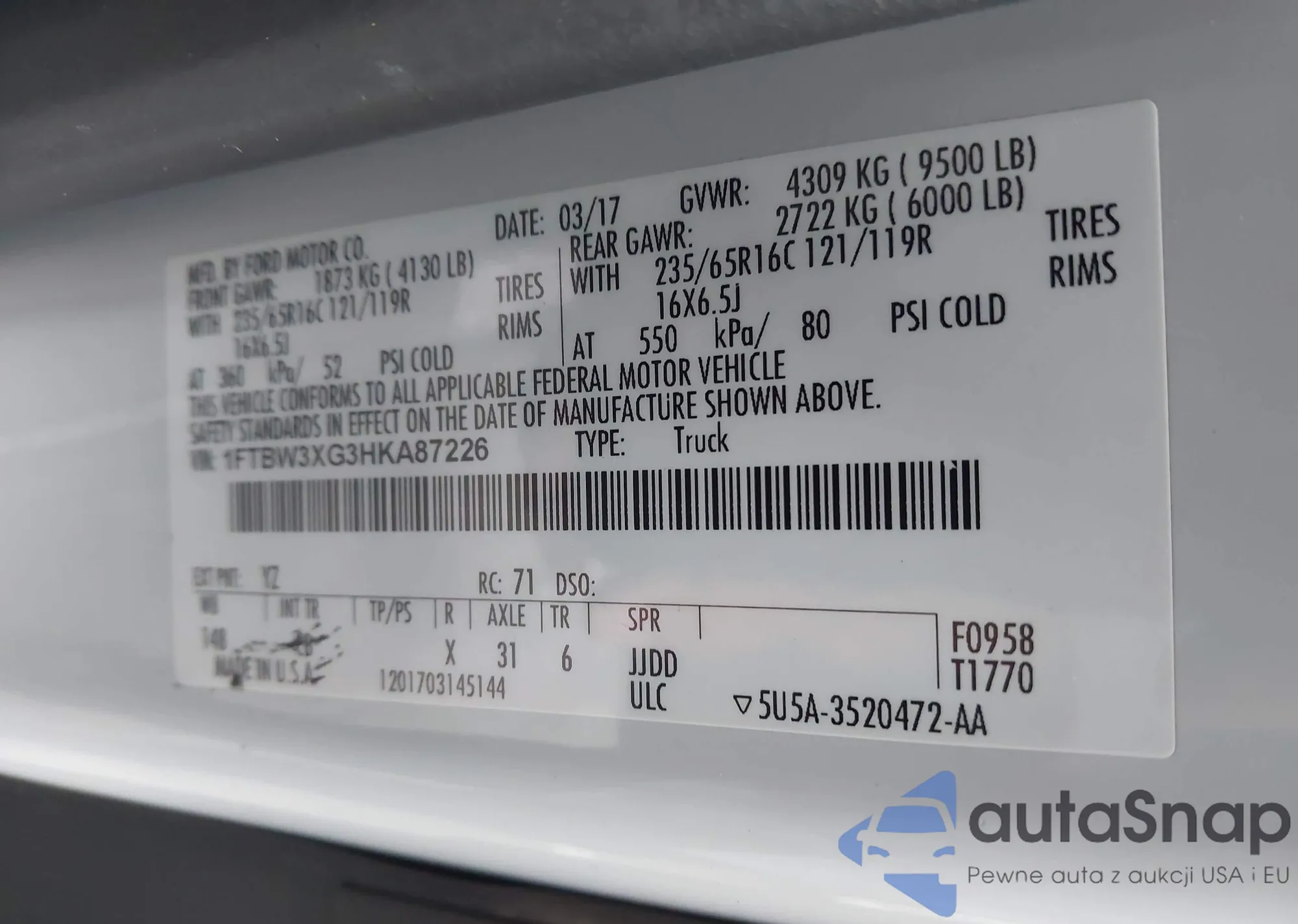 • VIN 1FTBW3XG3HKA87226