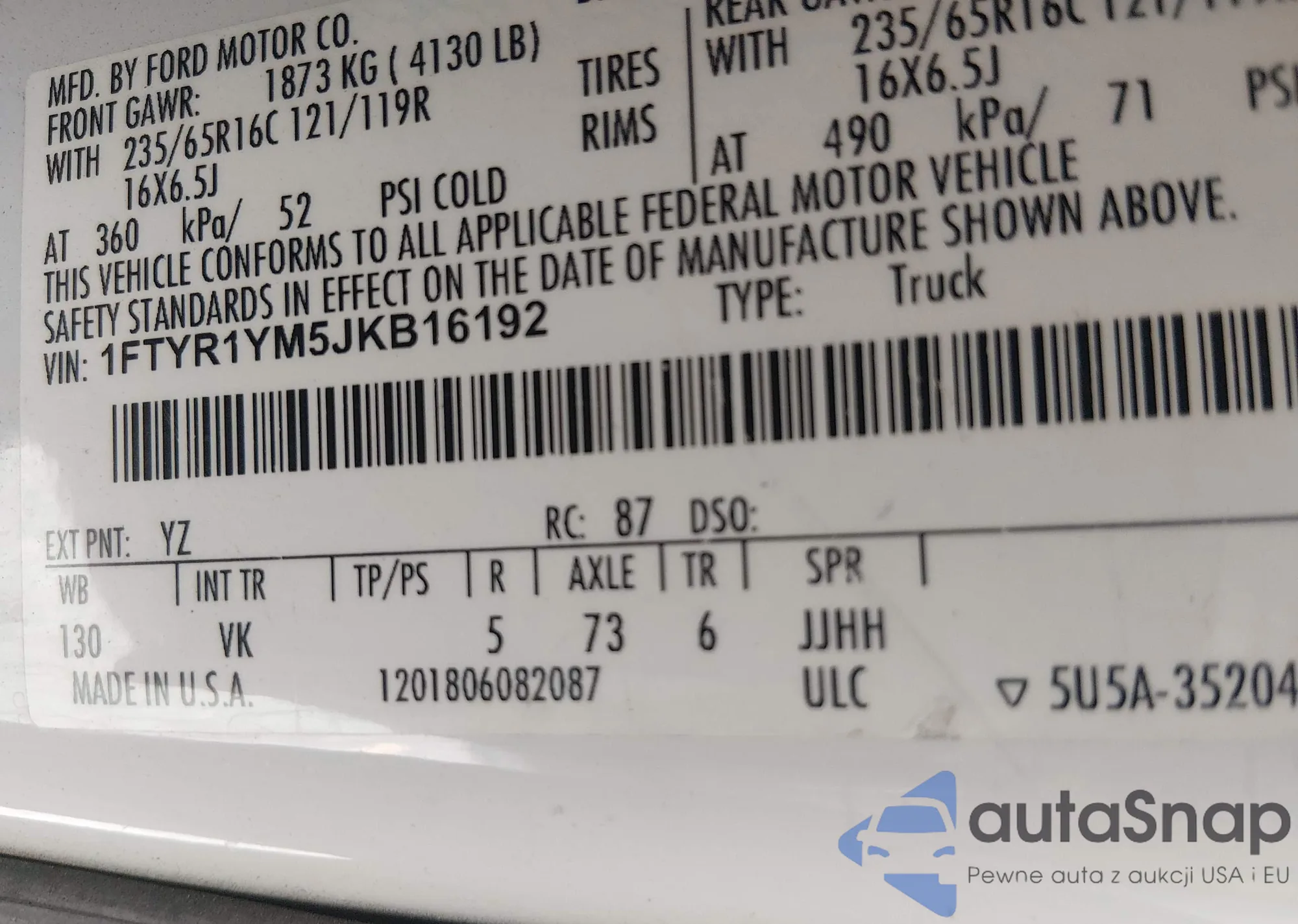 • VIN 1FTYR1YM5JKB16192