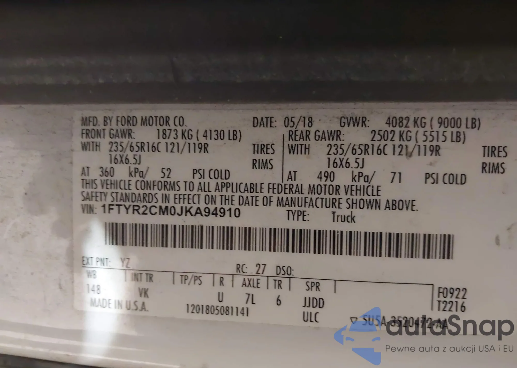 • VIN 1FTYR2CM0JKA94910