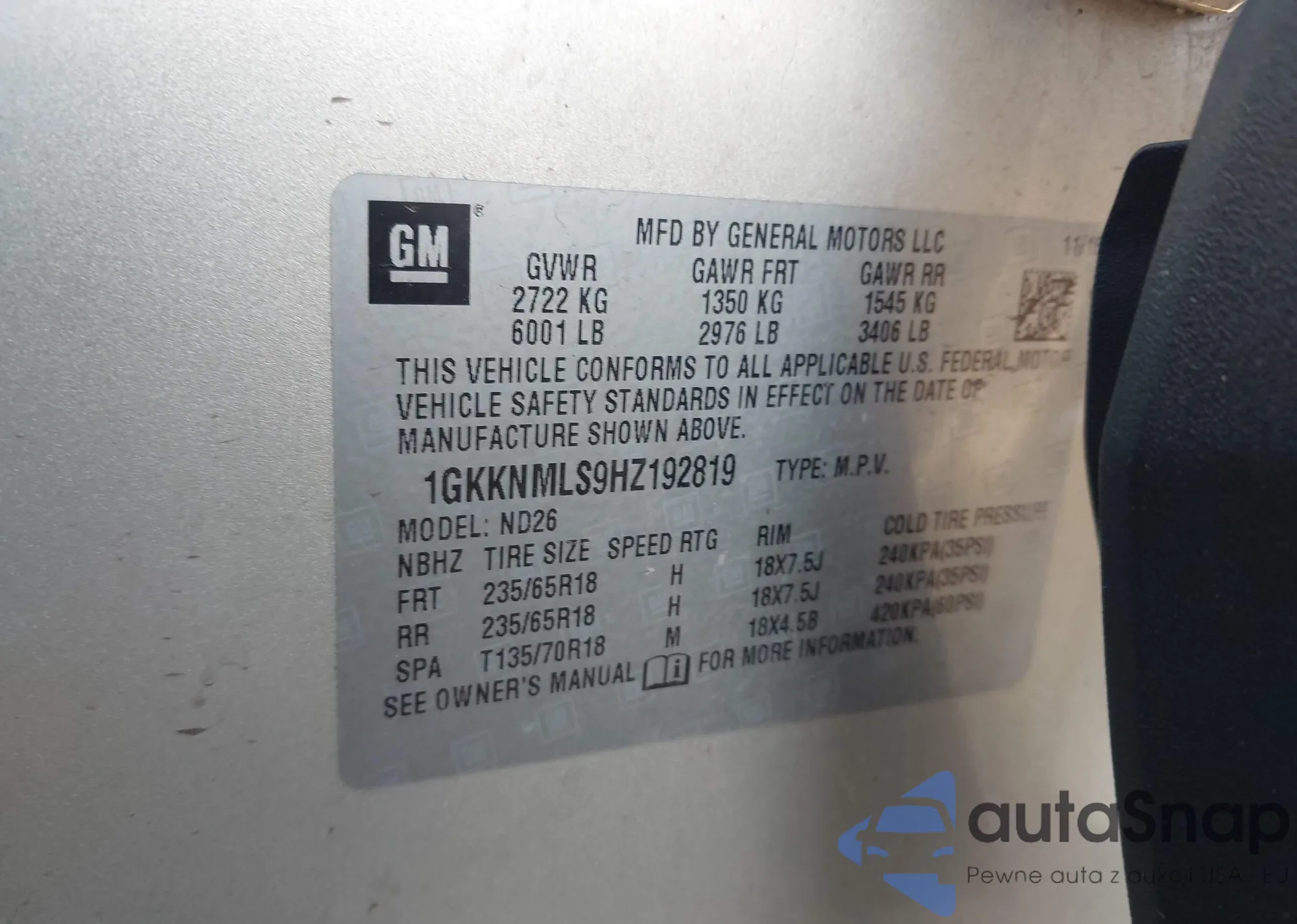 • VIN 1GKKNMLS9HZ192819