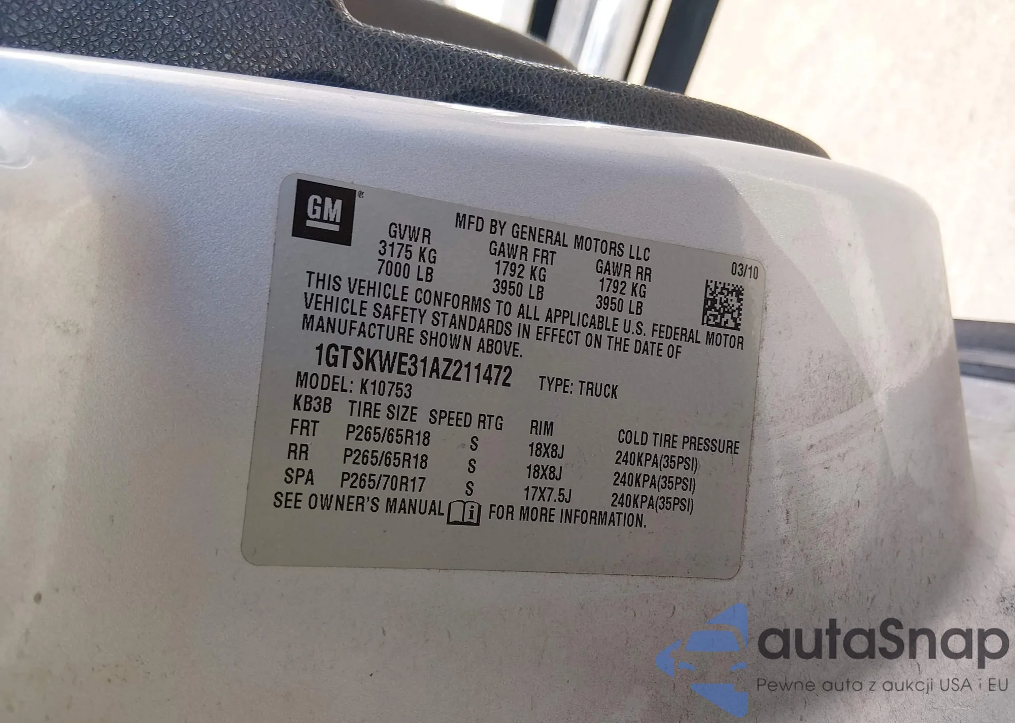• VIN 1GTSKWE31AZ211472
