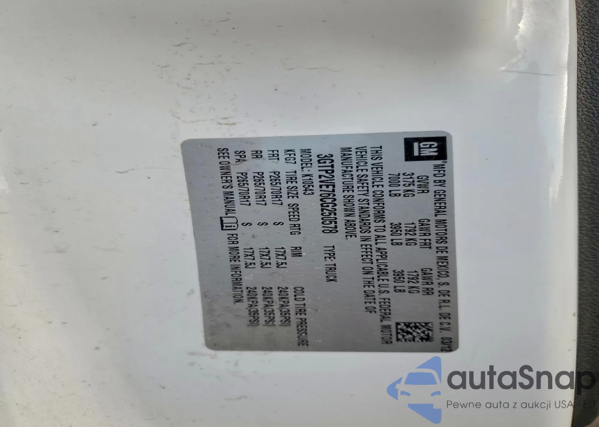 • VIN 3GTP2VE76CG250578