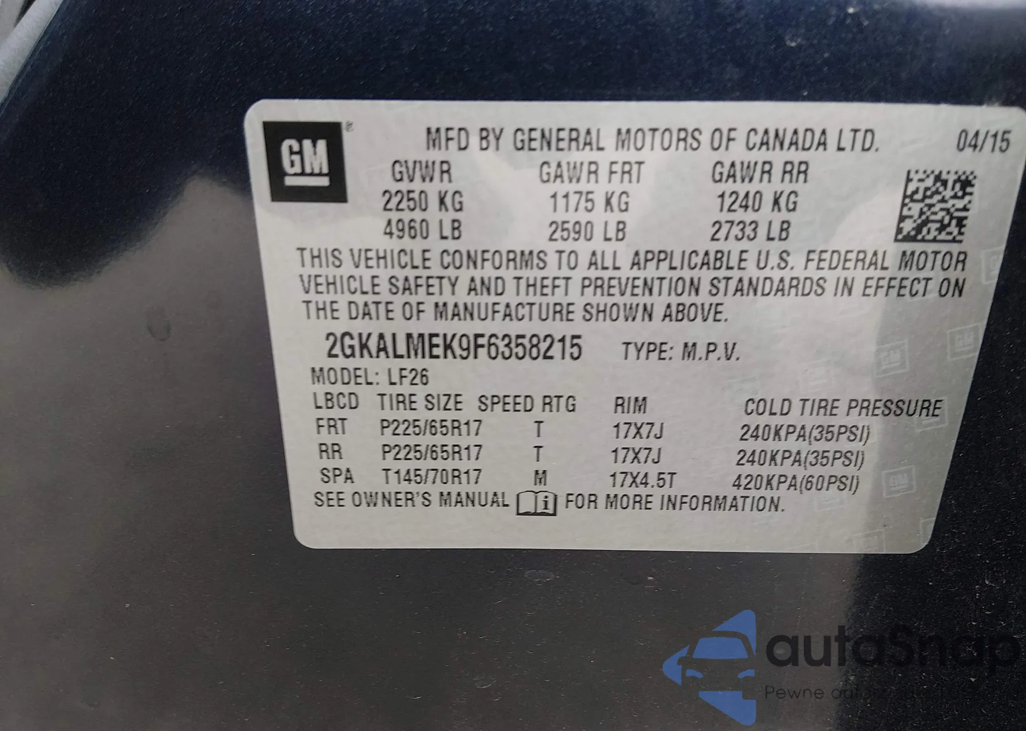 • VIN 2GKALMEK9F6358215