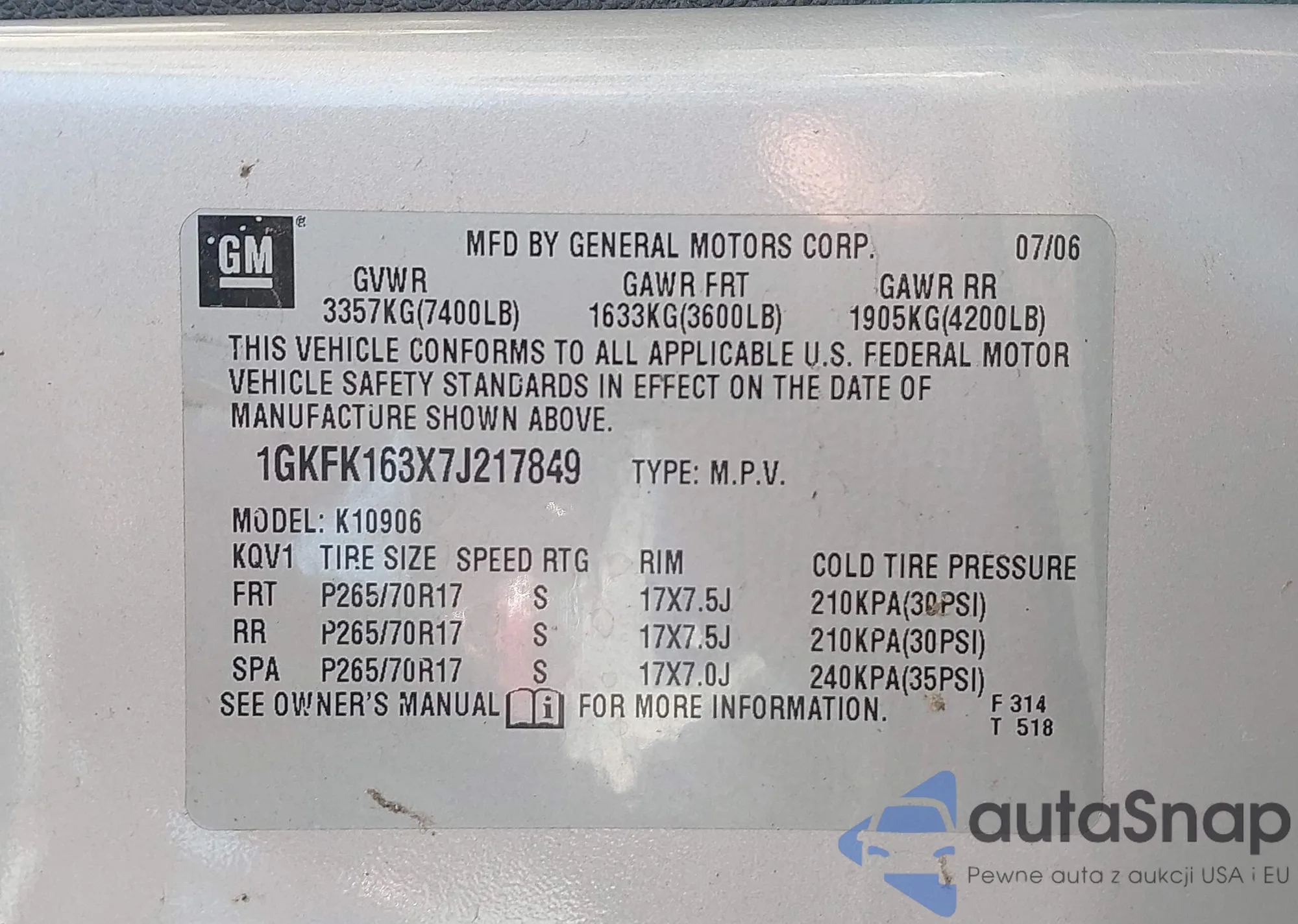 LOT: 44358495 VIN: 1GKFK163X7J217849