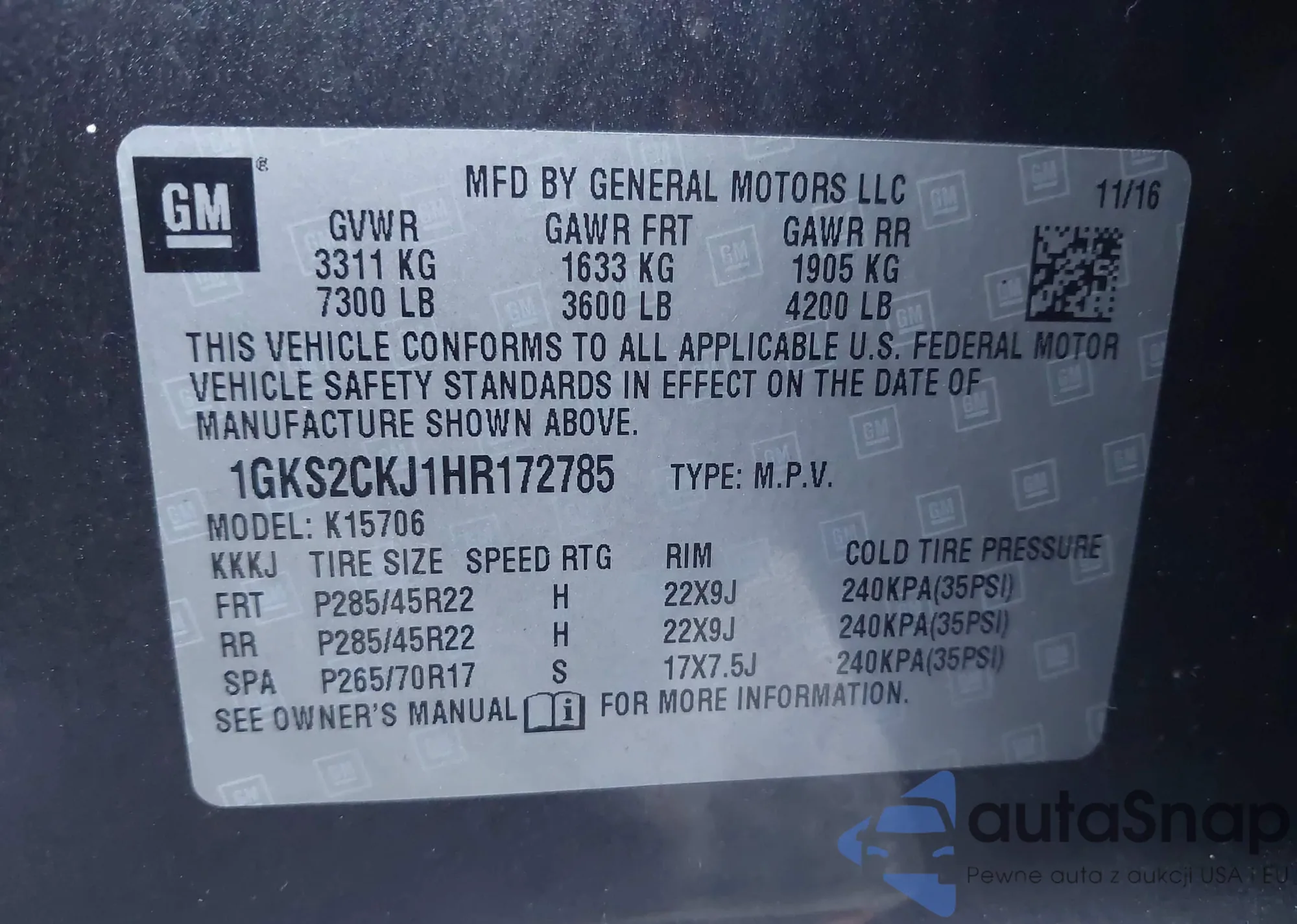 LOT: 44398114 VIN: 1GKS2CKJ1HR172785