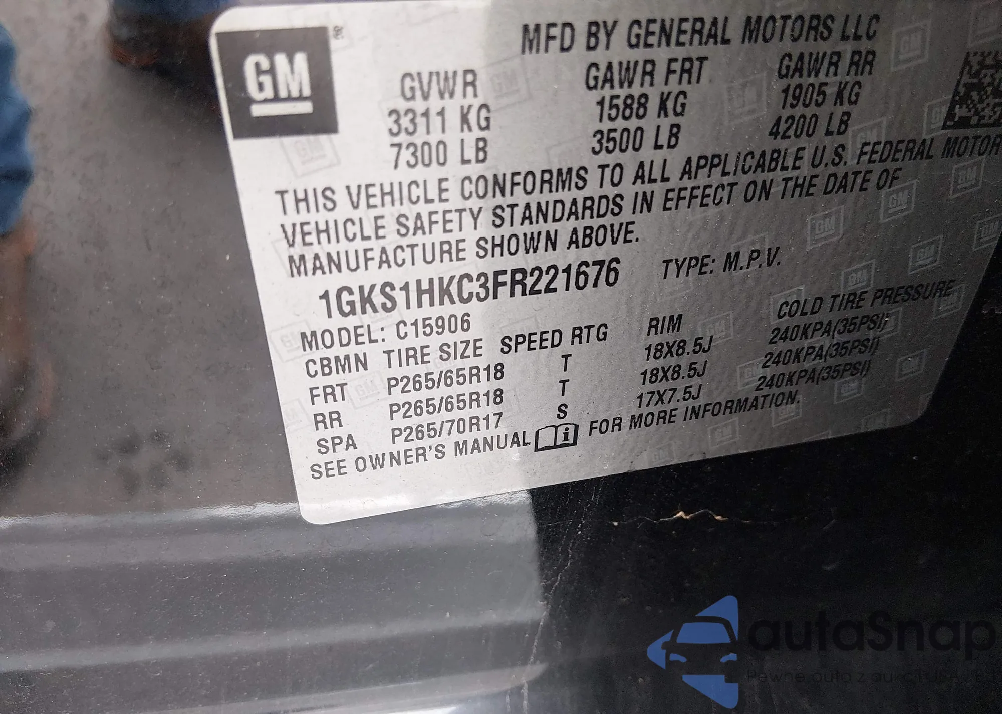 LOT: 44407845 VIN: 1GKS1HKC3FR221676