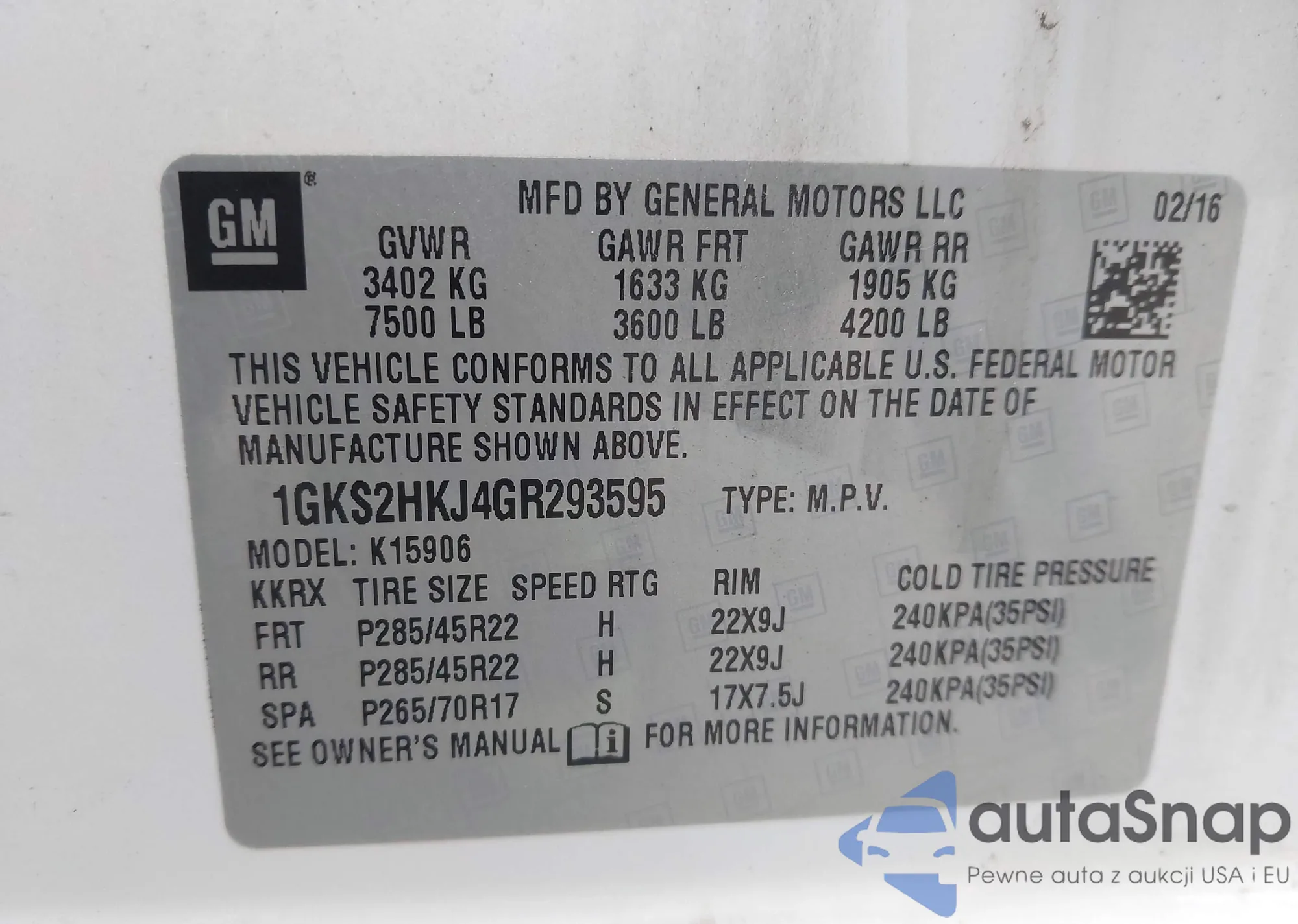 LOT: 44383050 VIN: 1GKS2HKJ4GR293595