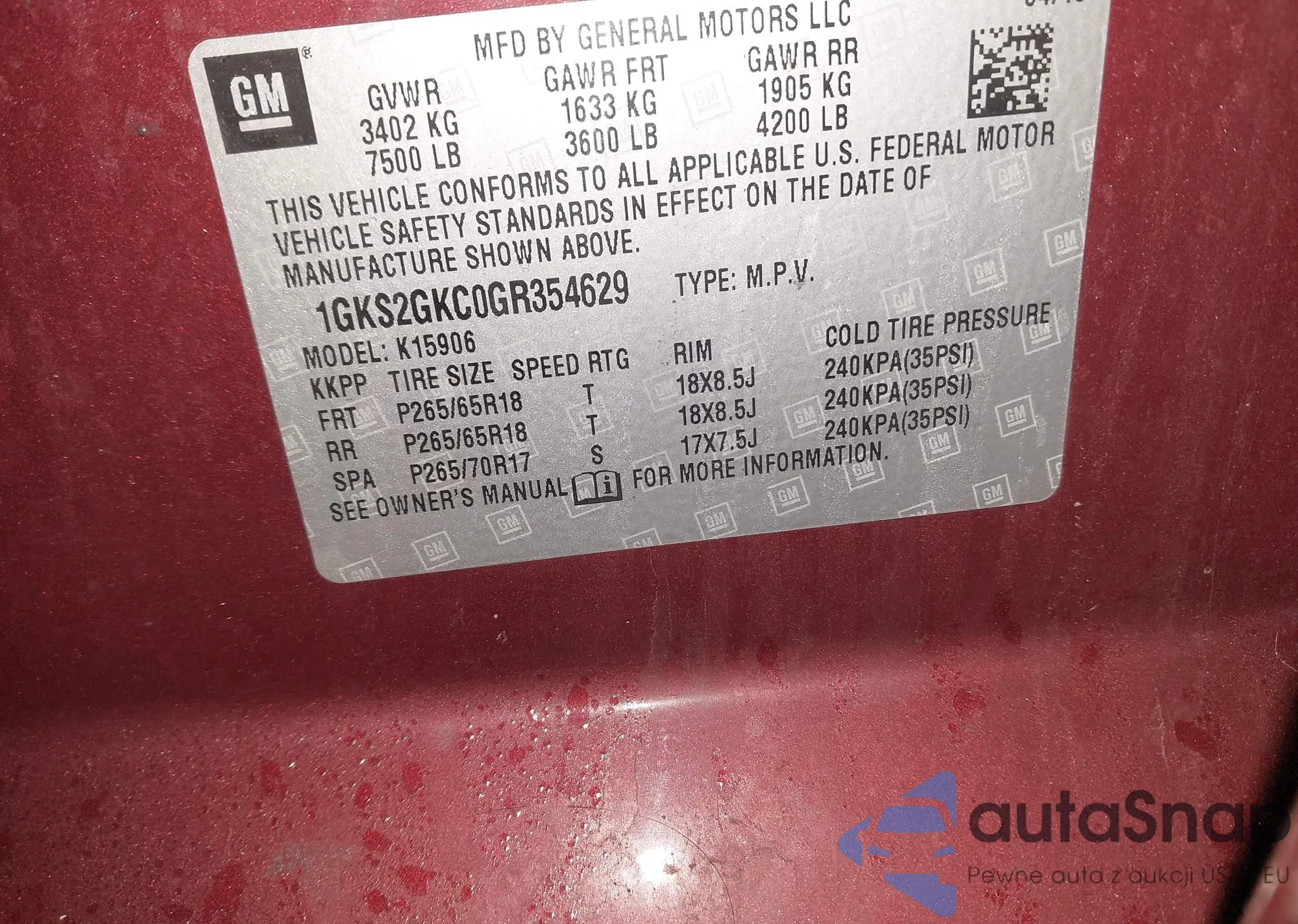 LOT: 44429135 VIN: 1GKS2GKC0GR354629
