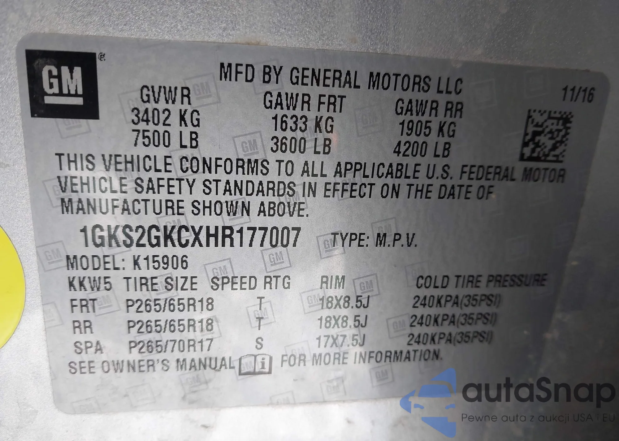 LOT: 44436506 VIN: 1GKS2GKCXHR177007