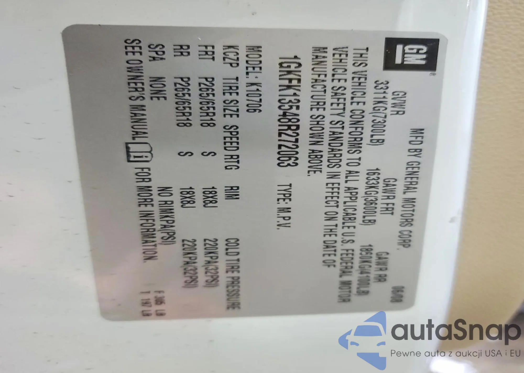 LOT: 76422915 VIN: 1GKFK13548R272063