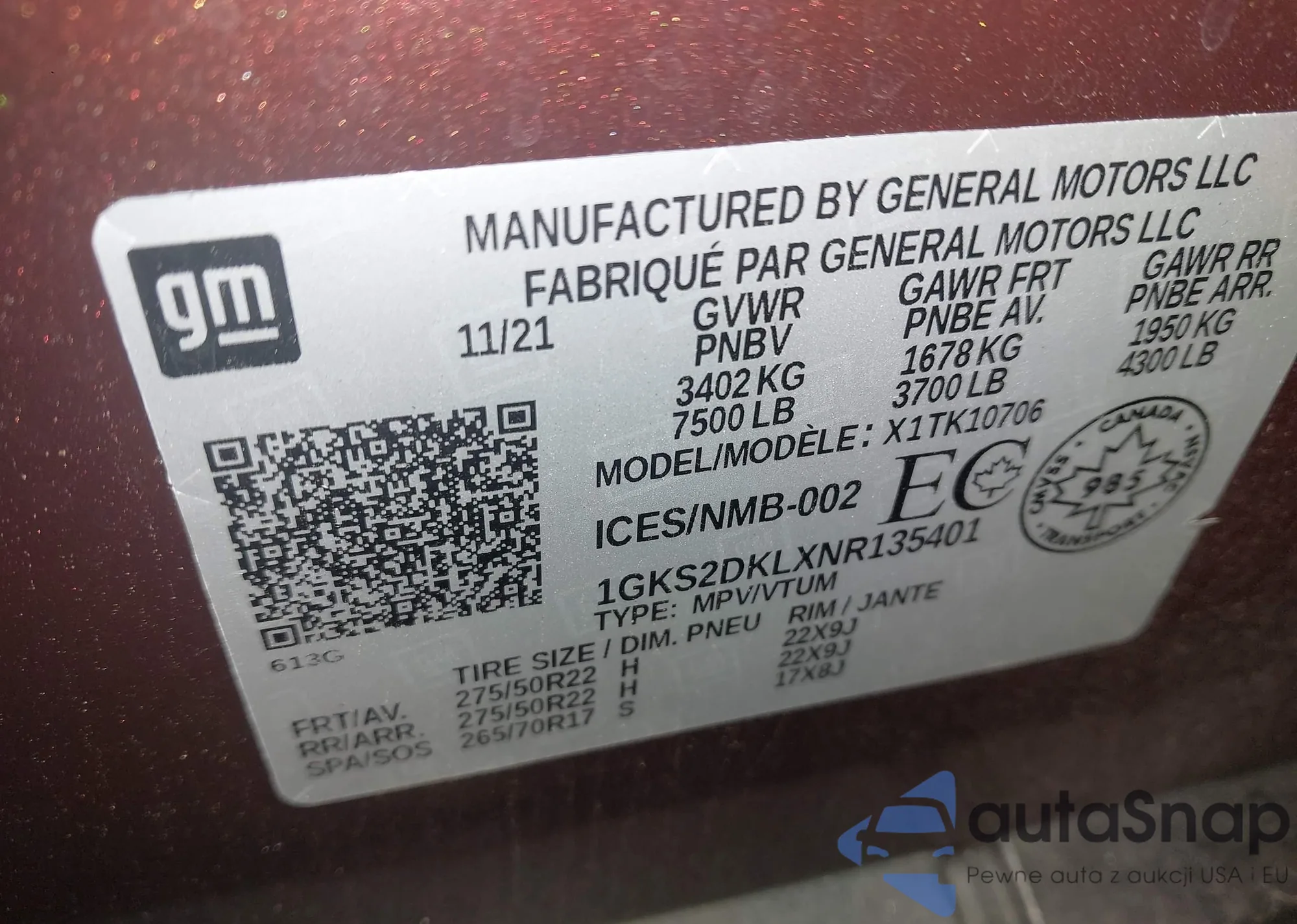 LOT: 44070897 VIN: 1GKS2DKLXNR135401