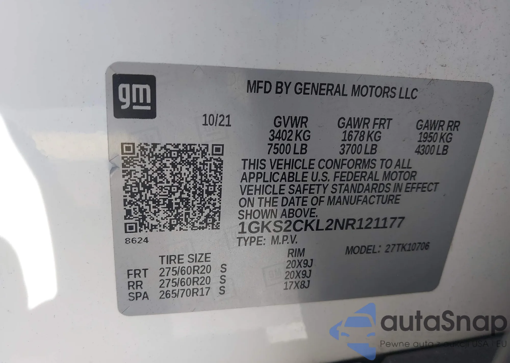 LOT: 44336599 VIN: 1GKS2CKL2NR121177