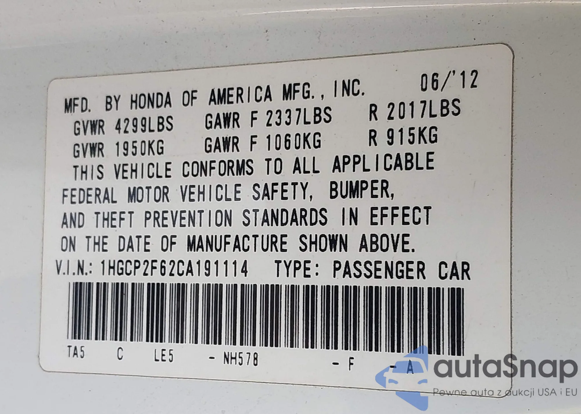 LOT: 44064190 VIN: 1HGCP2F62CA191114