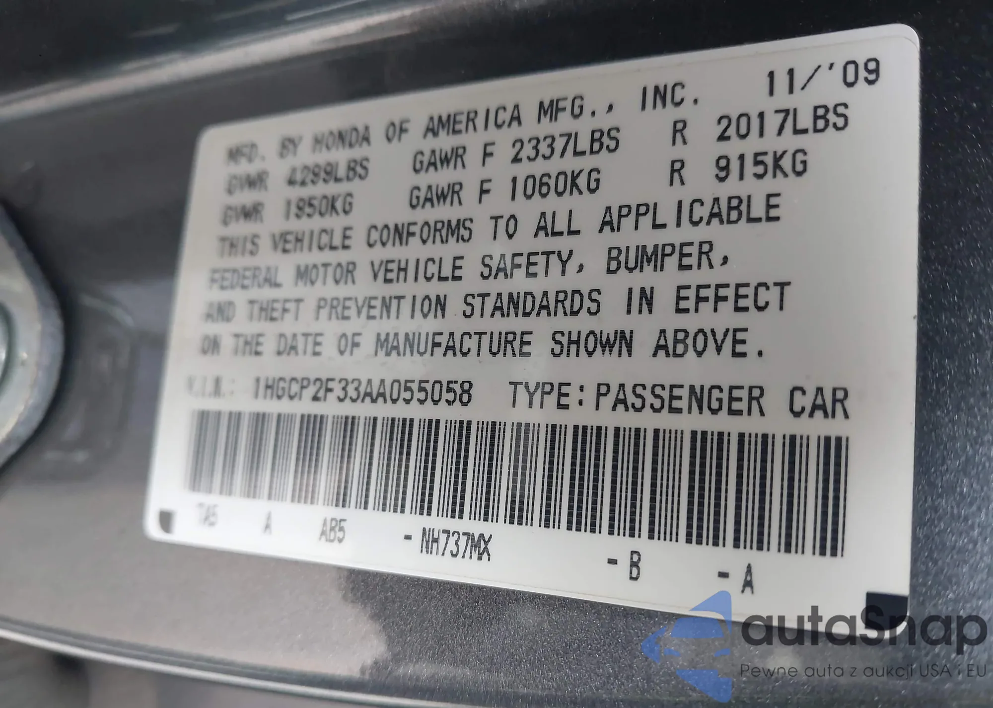 LOT: 44463264 VIN: 1HGCP2F33AA055058