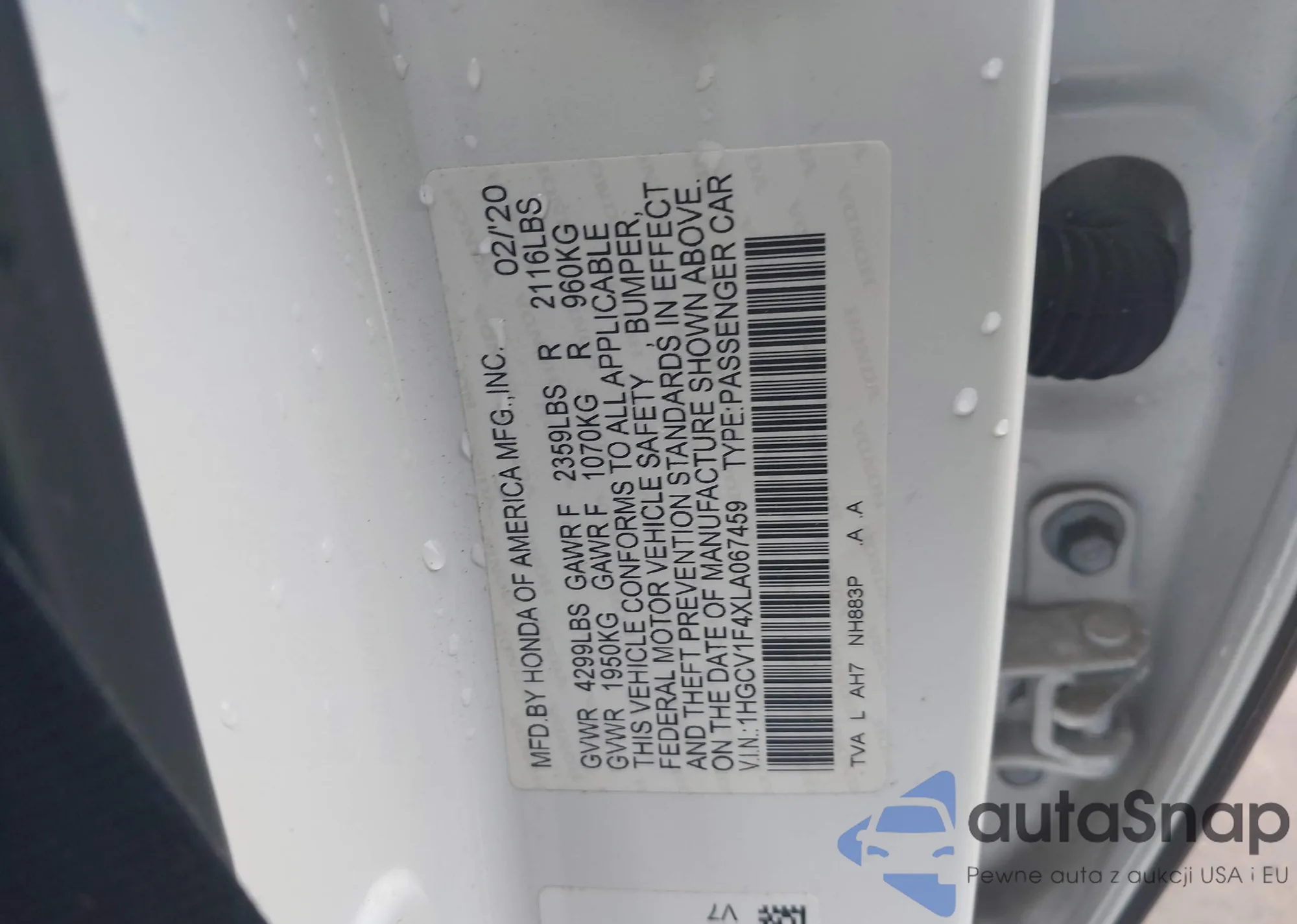 LOT: 43984117 VIN: 1HGCV2F93LA017245