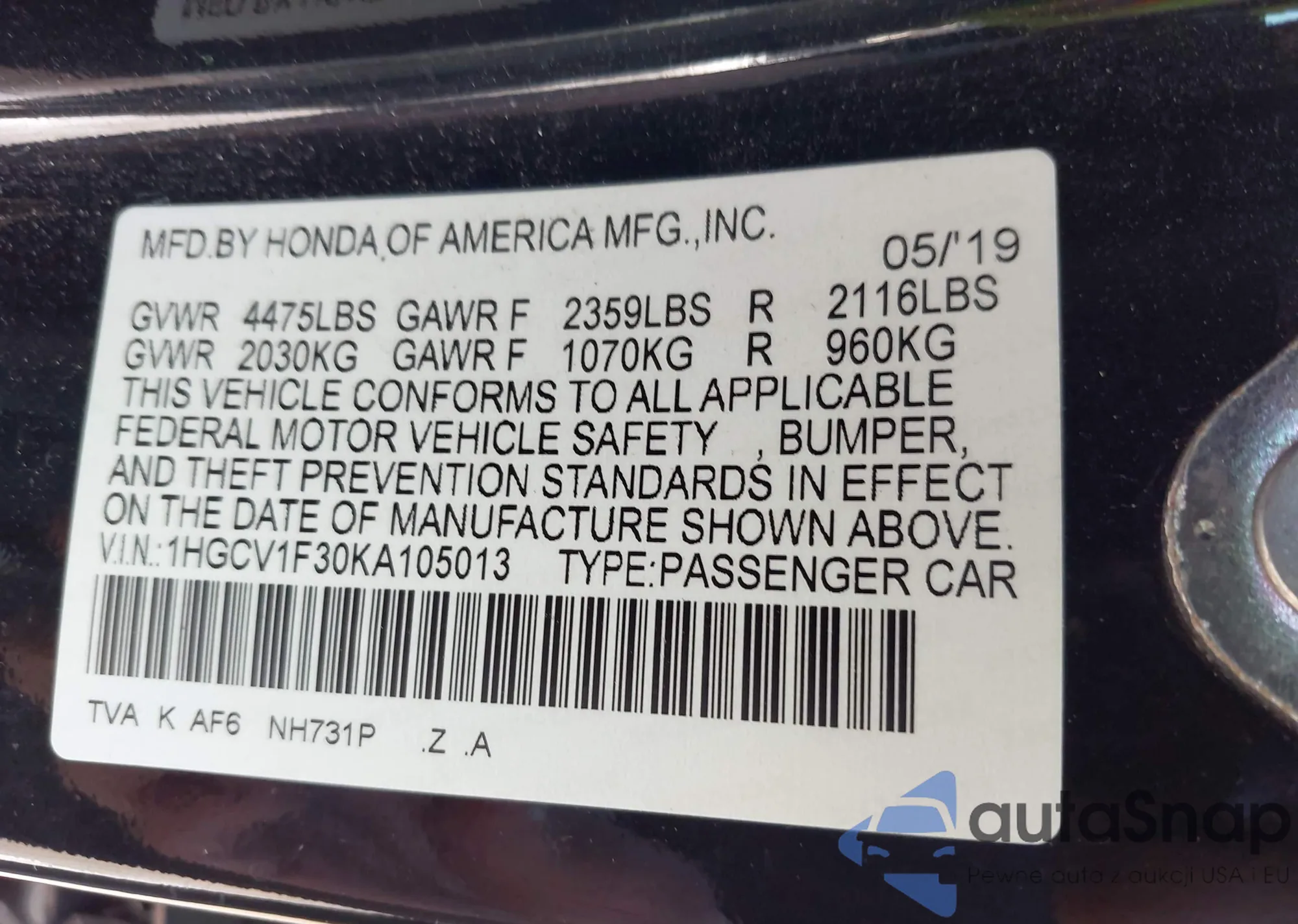 • VIN 1HGCV1F30KA105013
