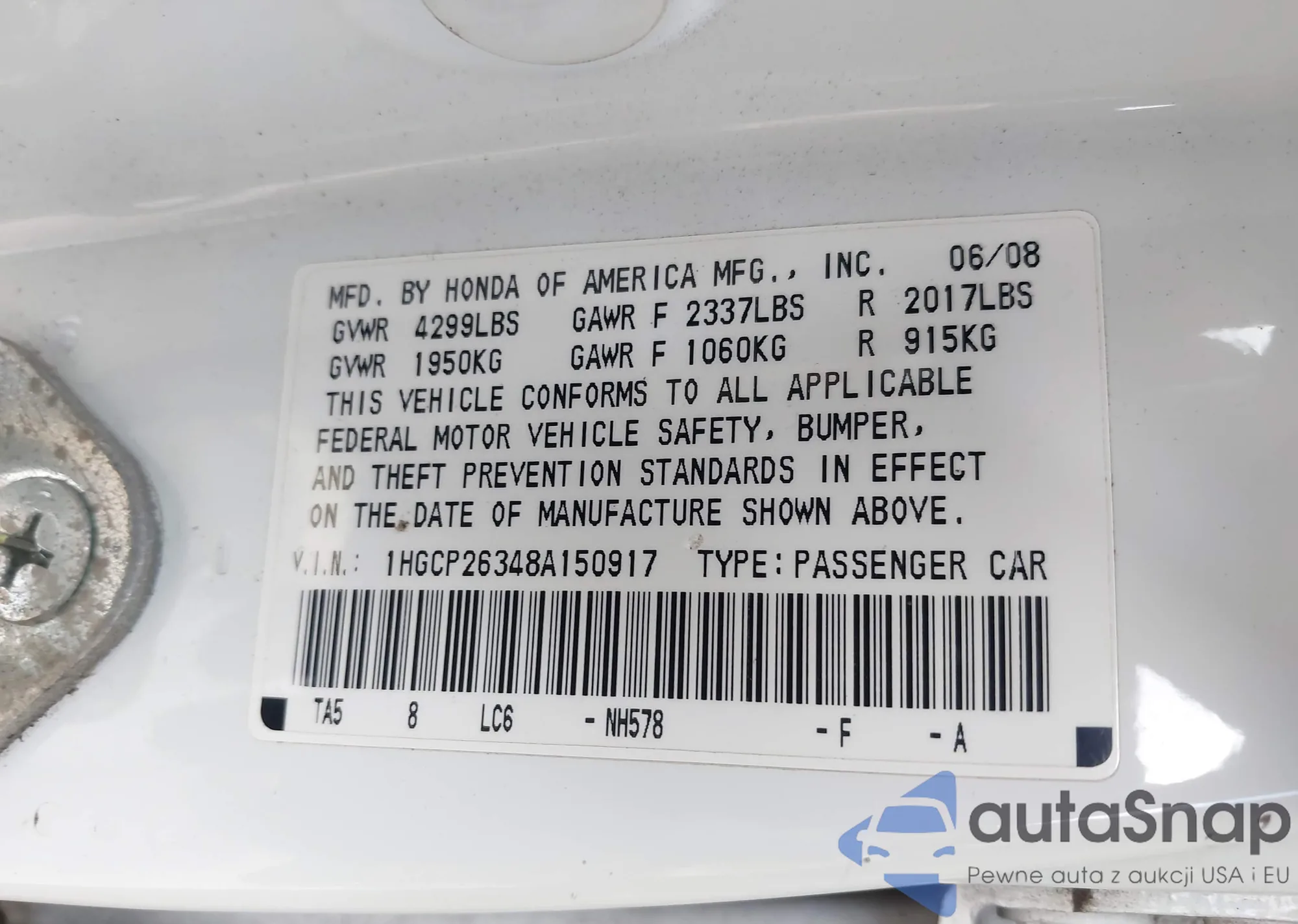 LOT: 44505227 VIN: 1HGCP26348A150917