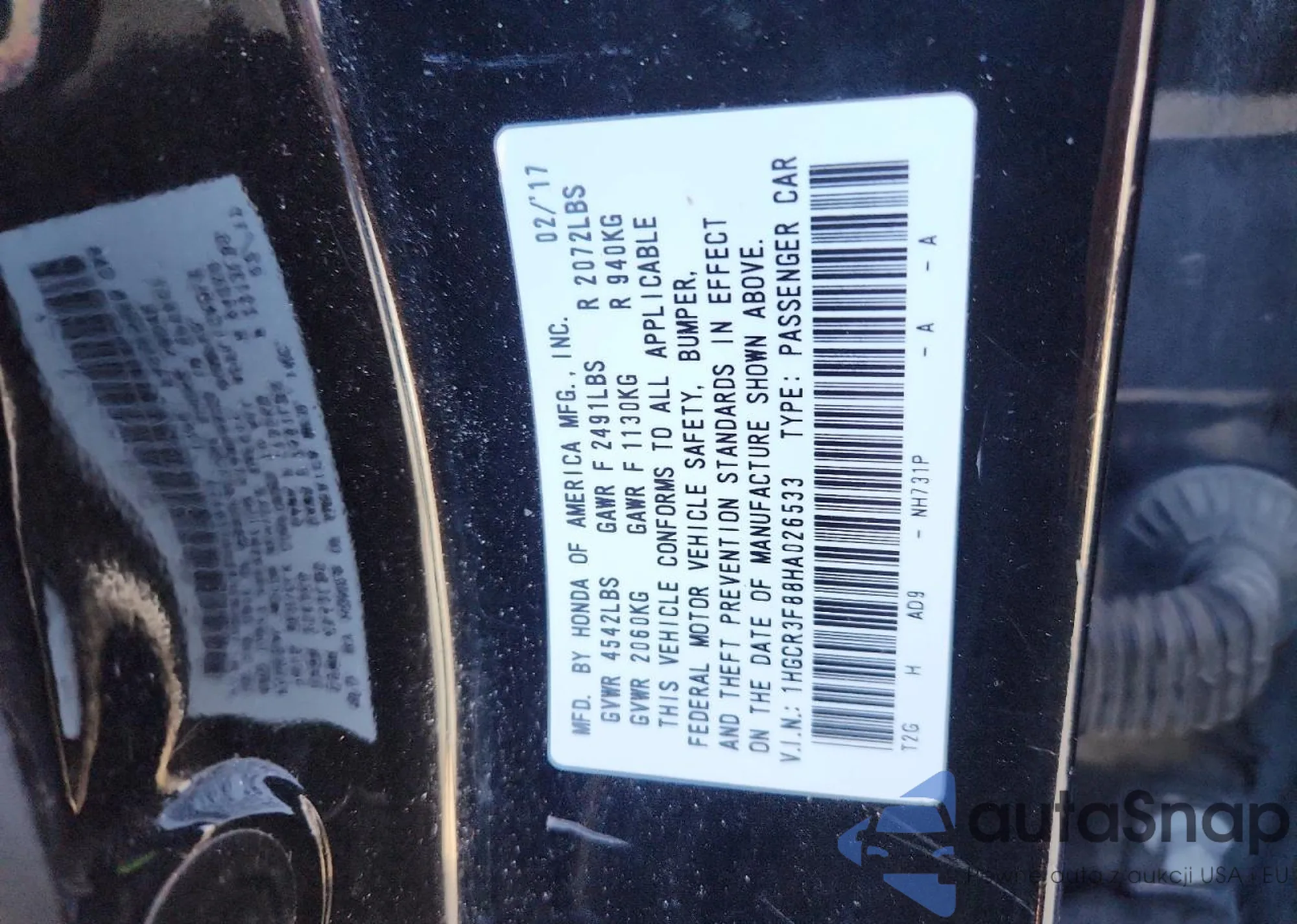 LOT: 91017845 VIN: 1HGCR3F88HA026533