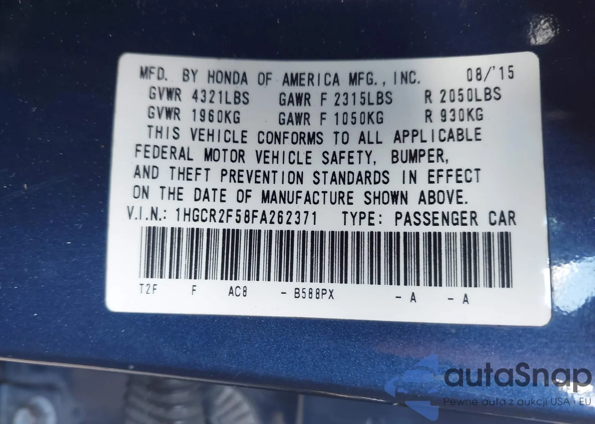 LOT: 44170573 VIN: 1HGCR2F58FA262371