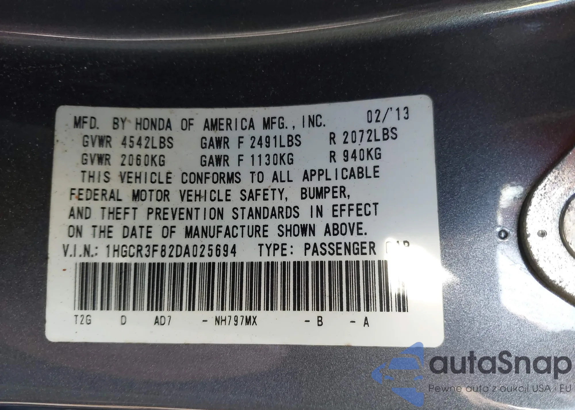 LOT: 44181191 VIN: 1HGCR3F82DA025694