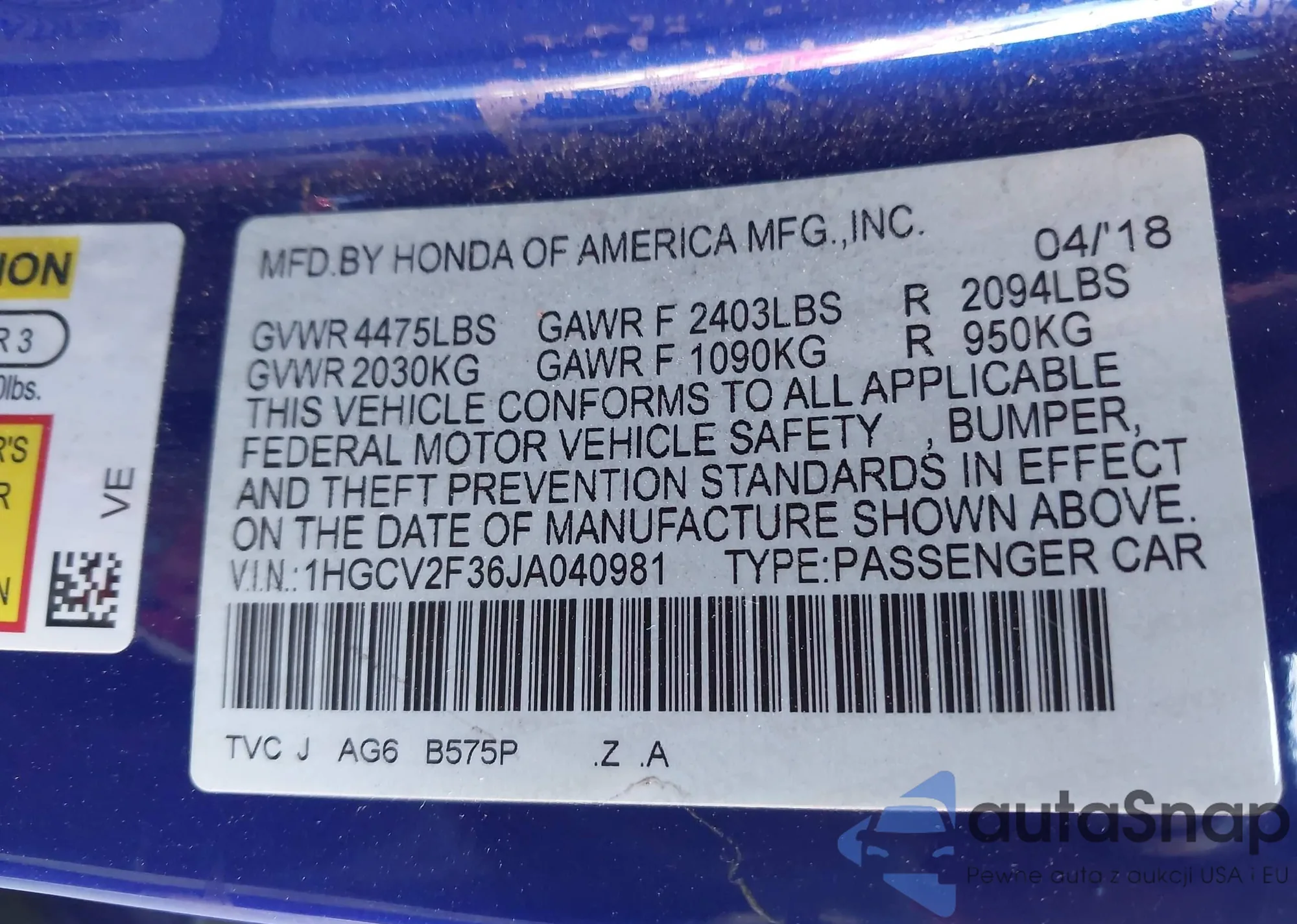 • VIN 1HGCV2F36JA040981