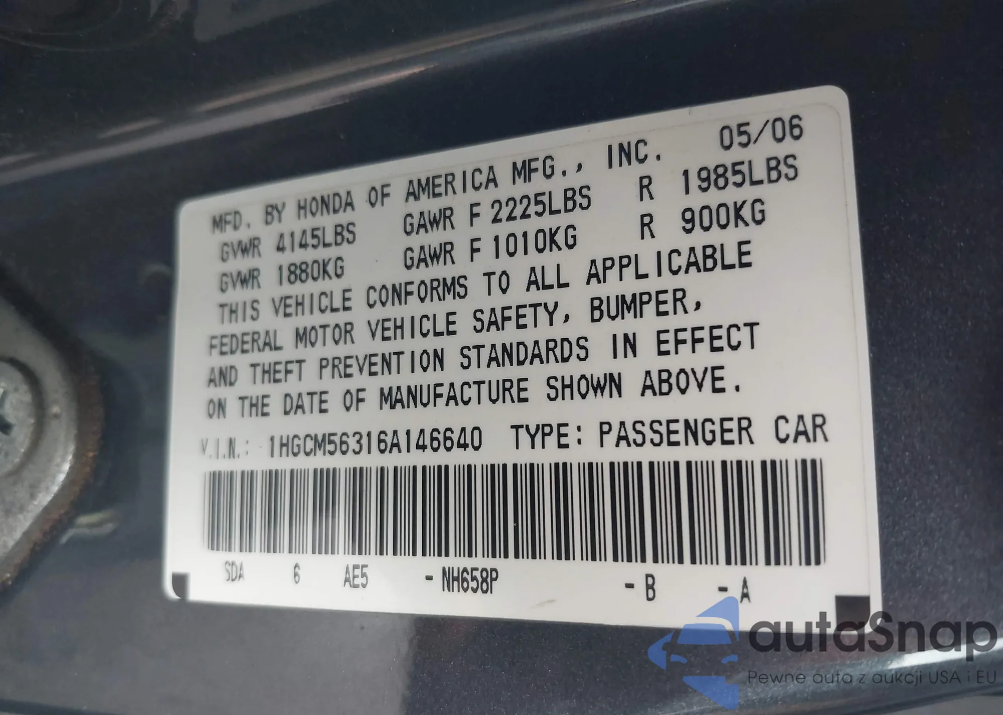 LOT: 44220681 VIN: 1HGCM66516A057853