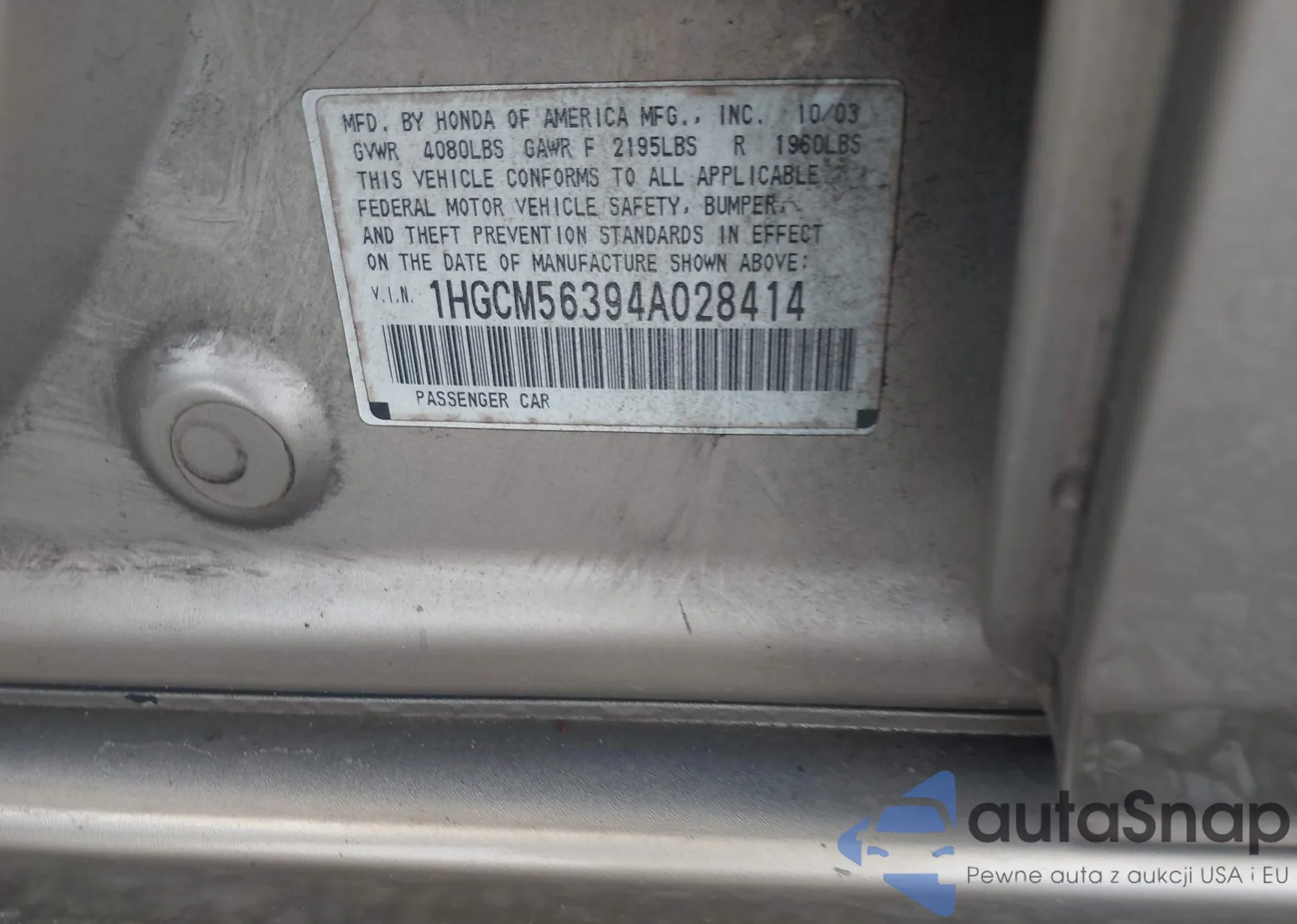 LOT: 44219660 VIN: 1HGCM56394A028414