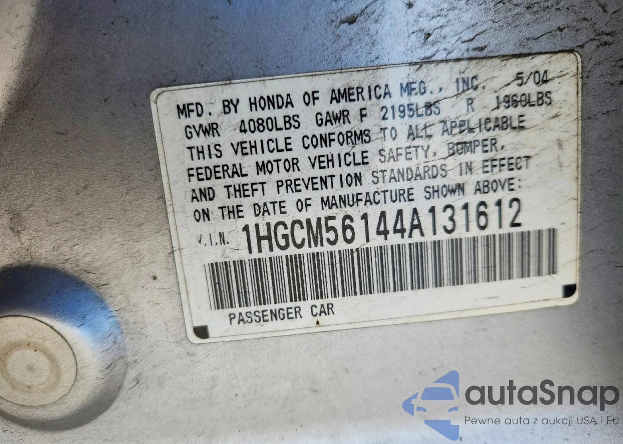 LOT: 74287365 VIN: 1HGCM56144A131612