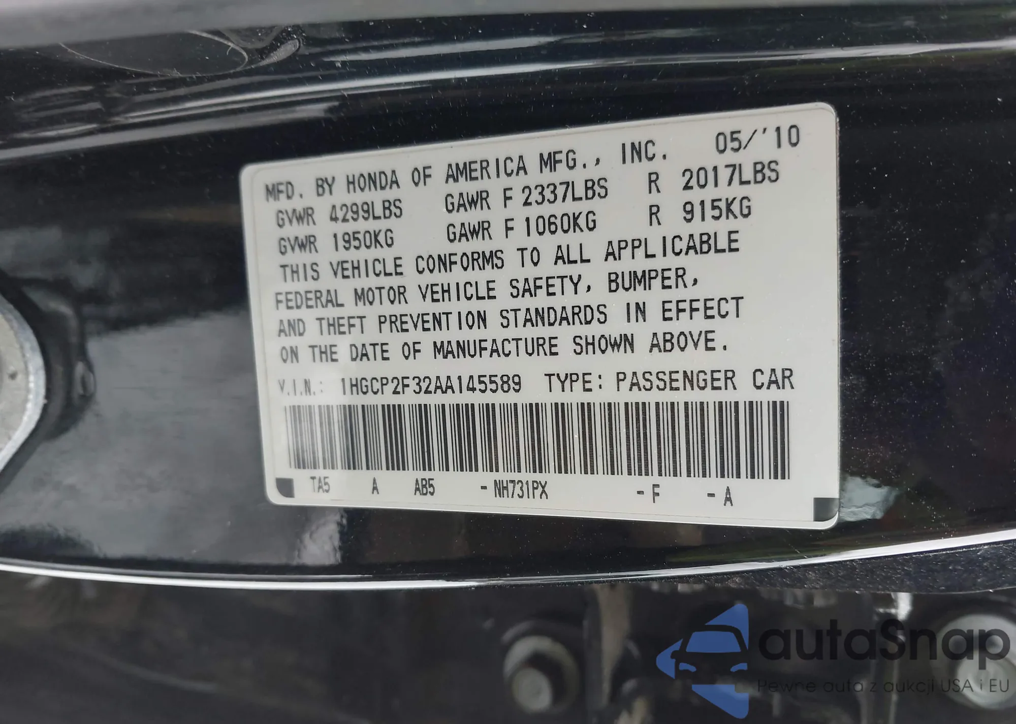LOT: 44219179 VIN: 1HGCP2F32AA145589