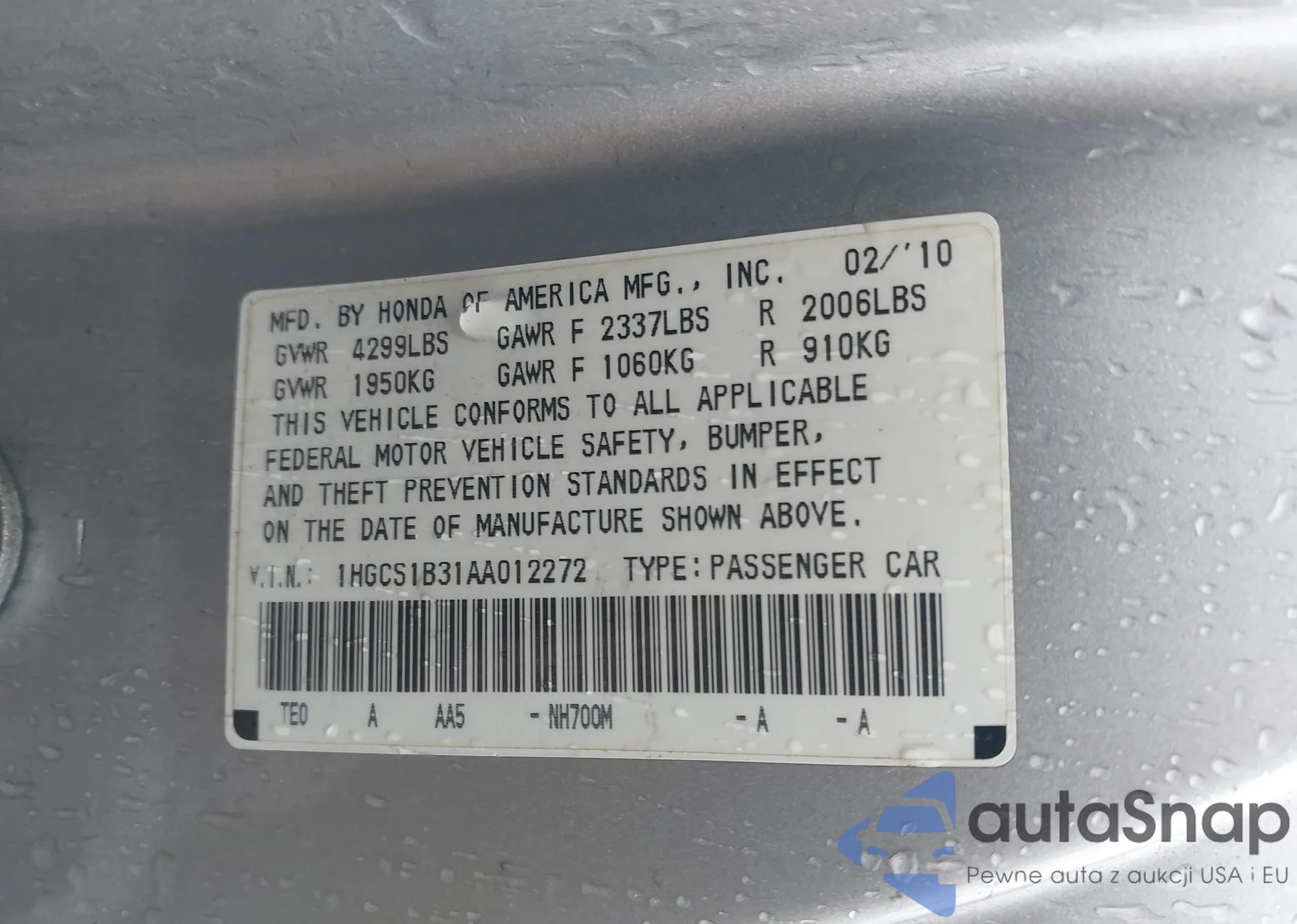 LOT: 94294475 VIN: 1HGCP2F77AA020221