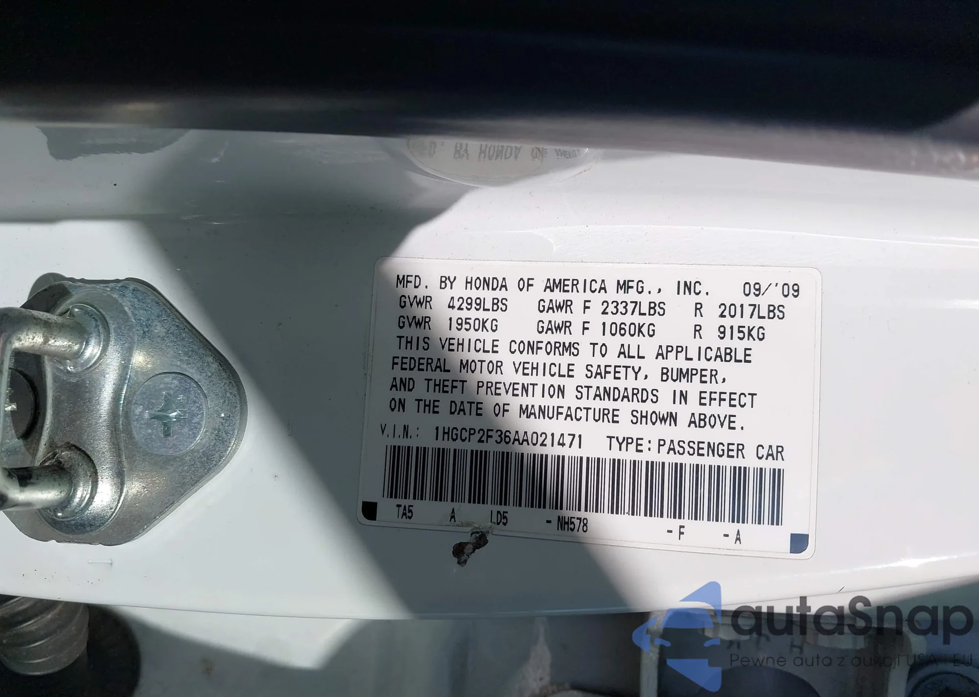 • VIN 1HGCP2F36AA021471