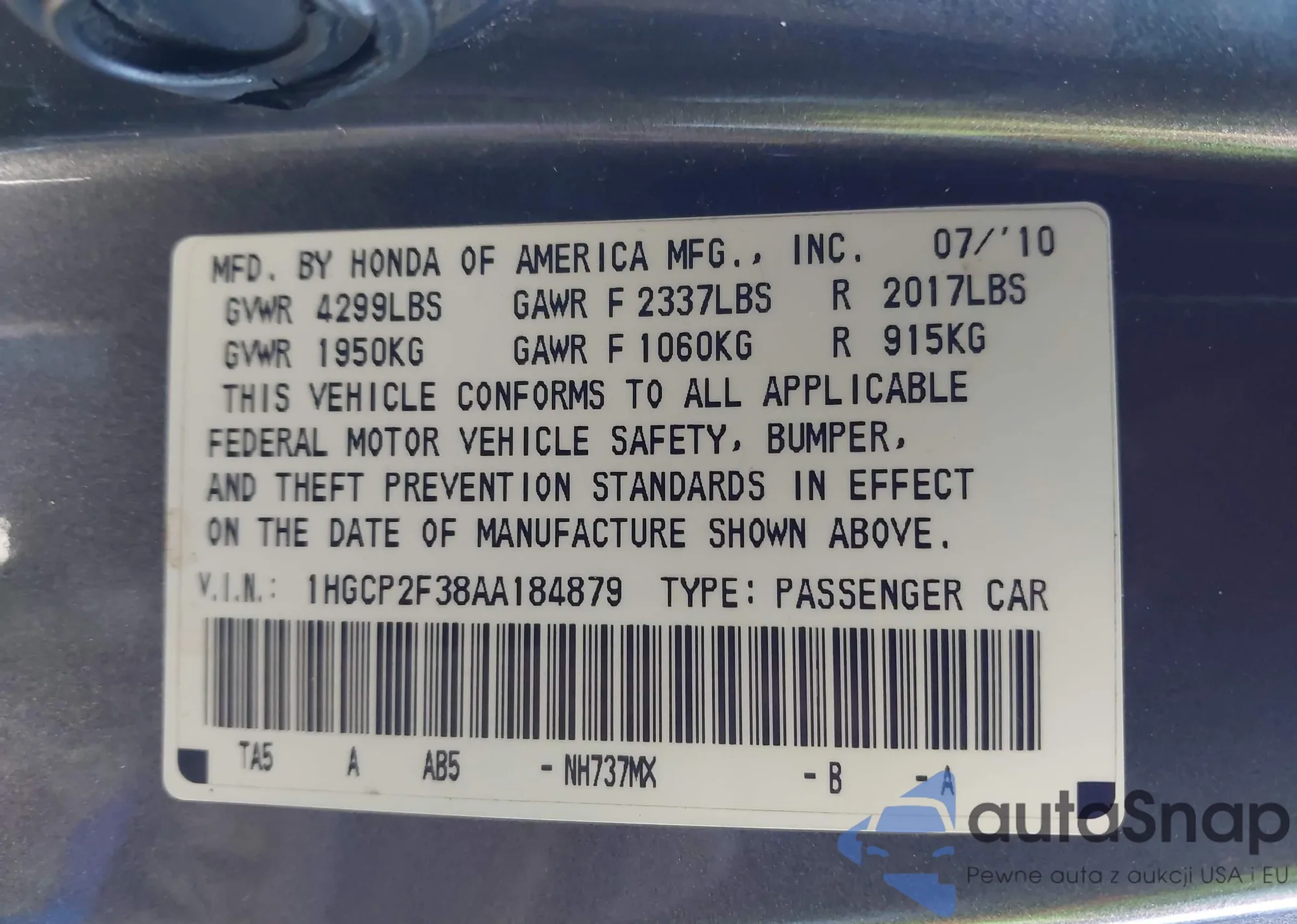 LOT: 44364869 VIN: 1HGCP2F38AA184879