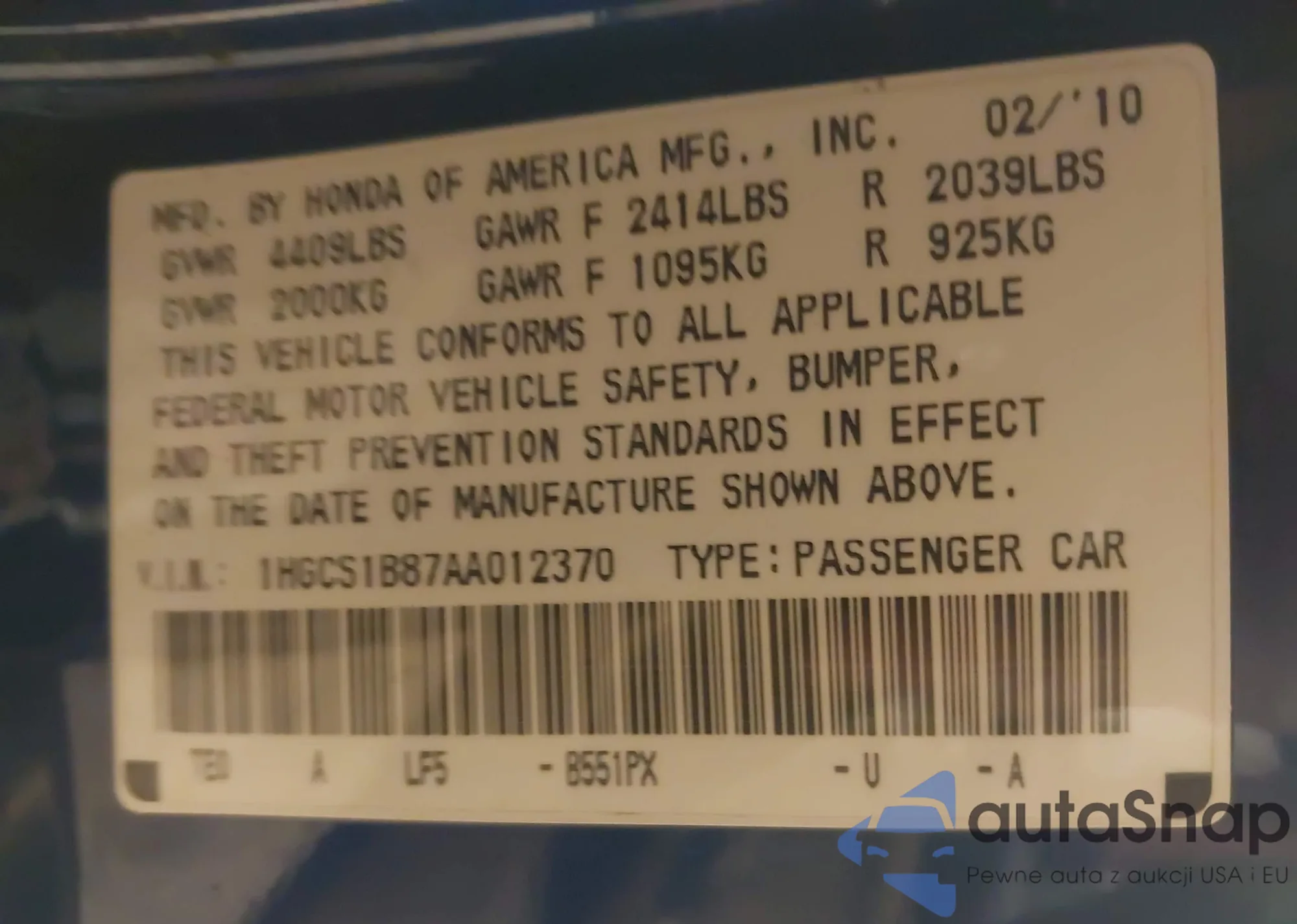 LOT: 43607906 VIN: 1HGCP2F37AA100180