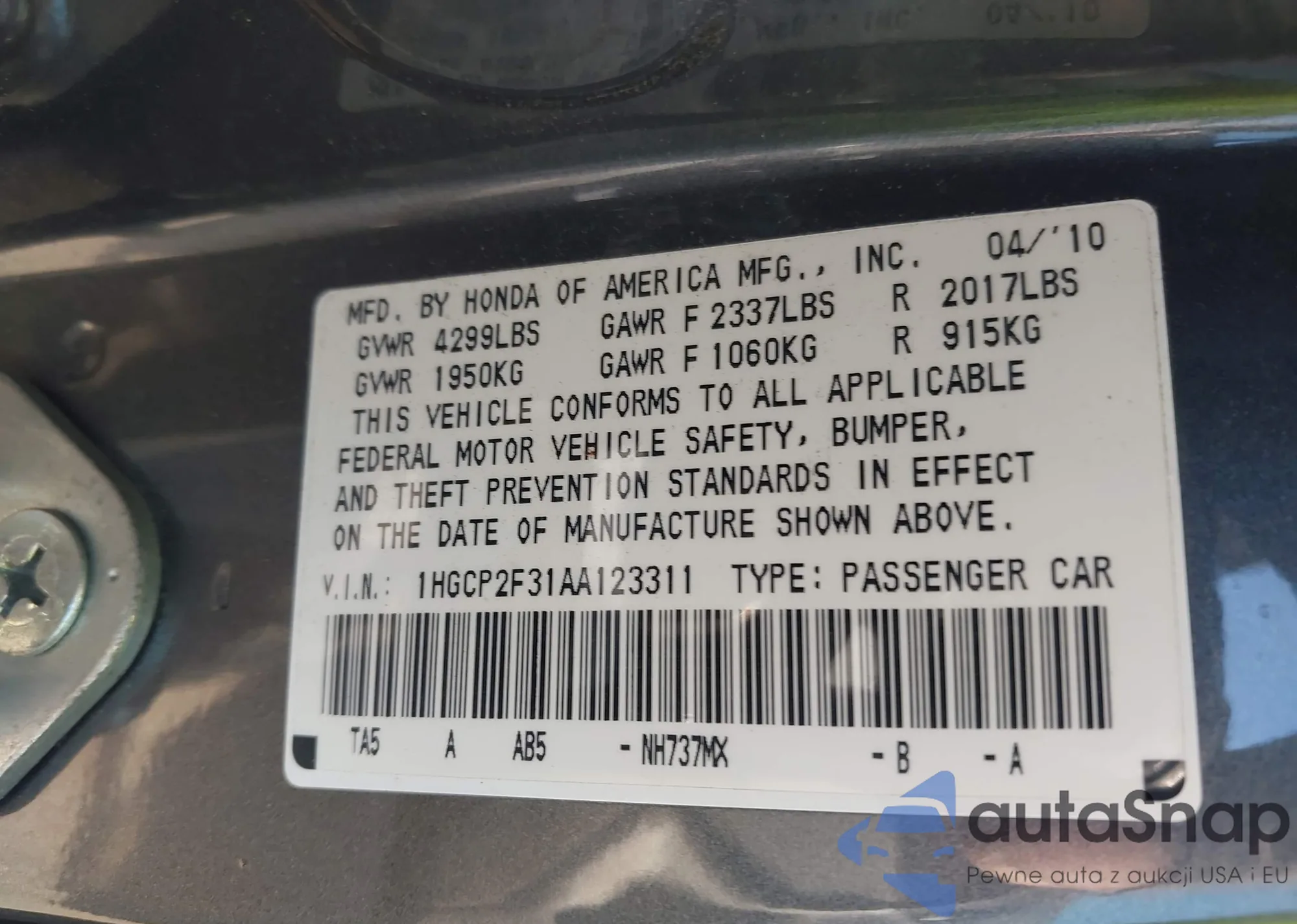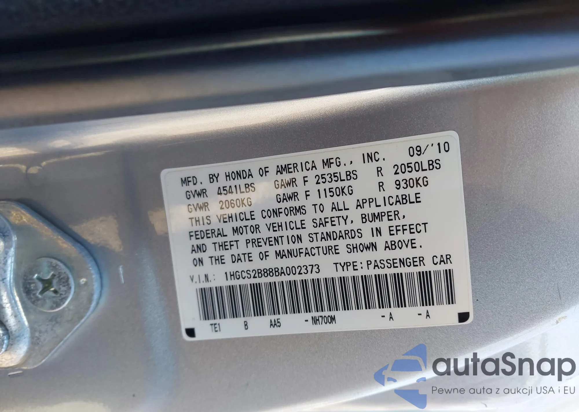 LOT: 43776204 VIN: 1HGCP2F77AA091175