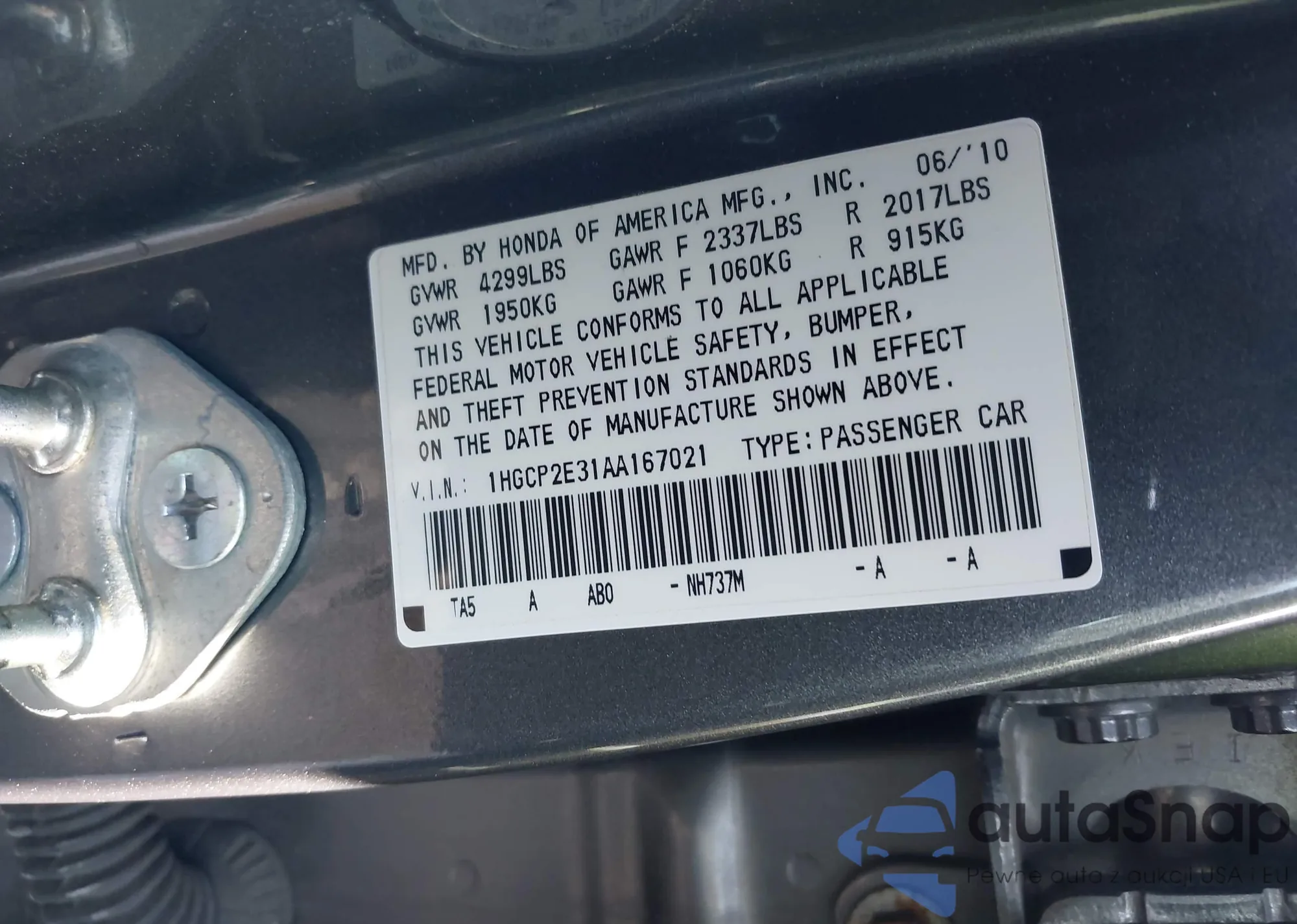 • VIN 1HGCP2E31AA167021